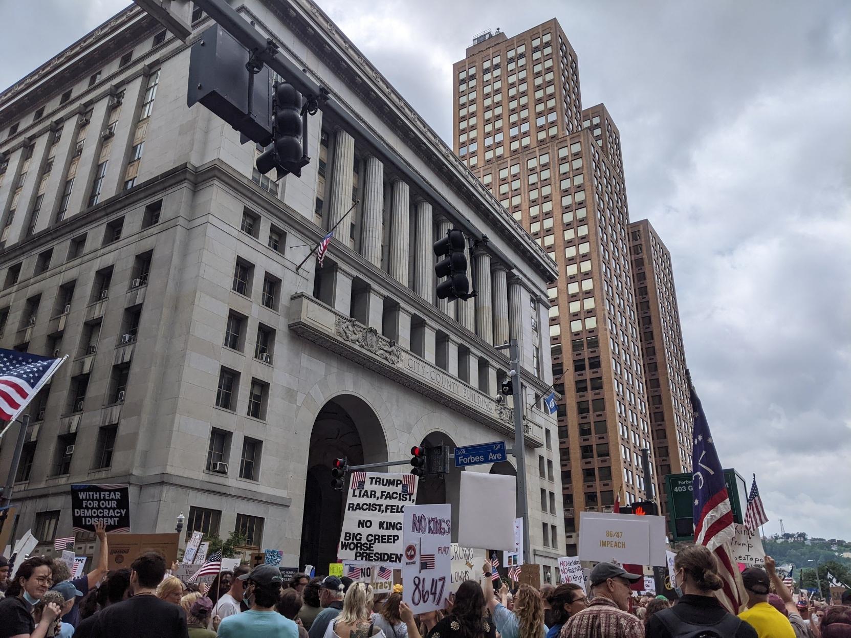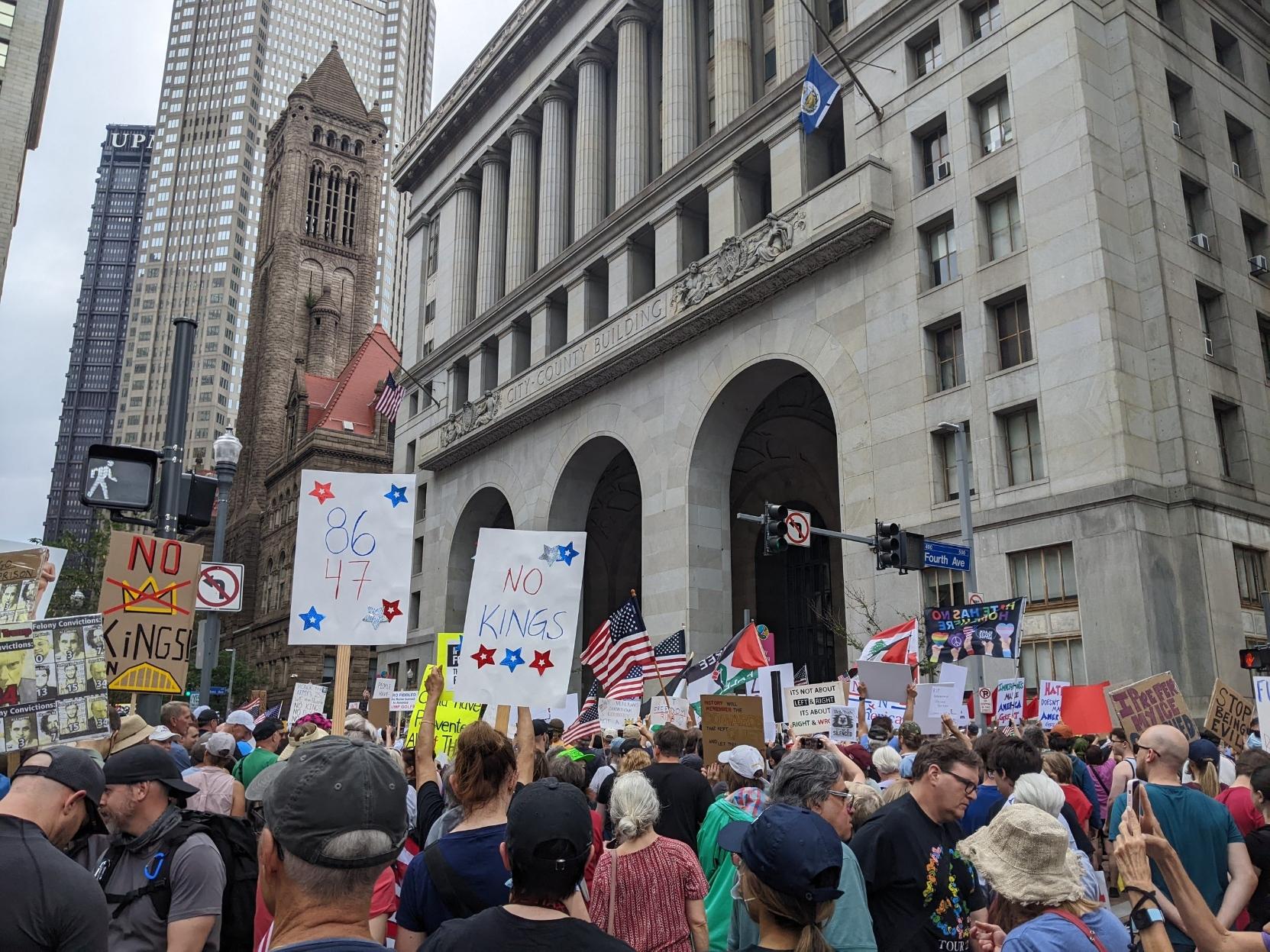 Crowd outside City county building, including little kid. The t shirt of a man with white mohawk style hair has "no kings" and a crossed out crown in marker, and below that "Fick-Dich Drumpf". Another man with his arm up has a dark blue T-shirt that says We the People in a US Constitution calligraphy font
