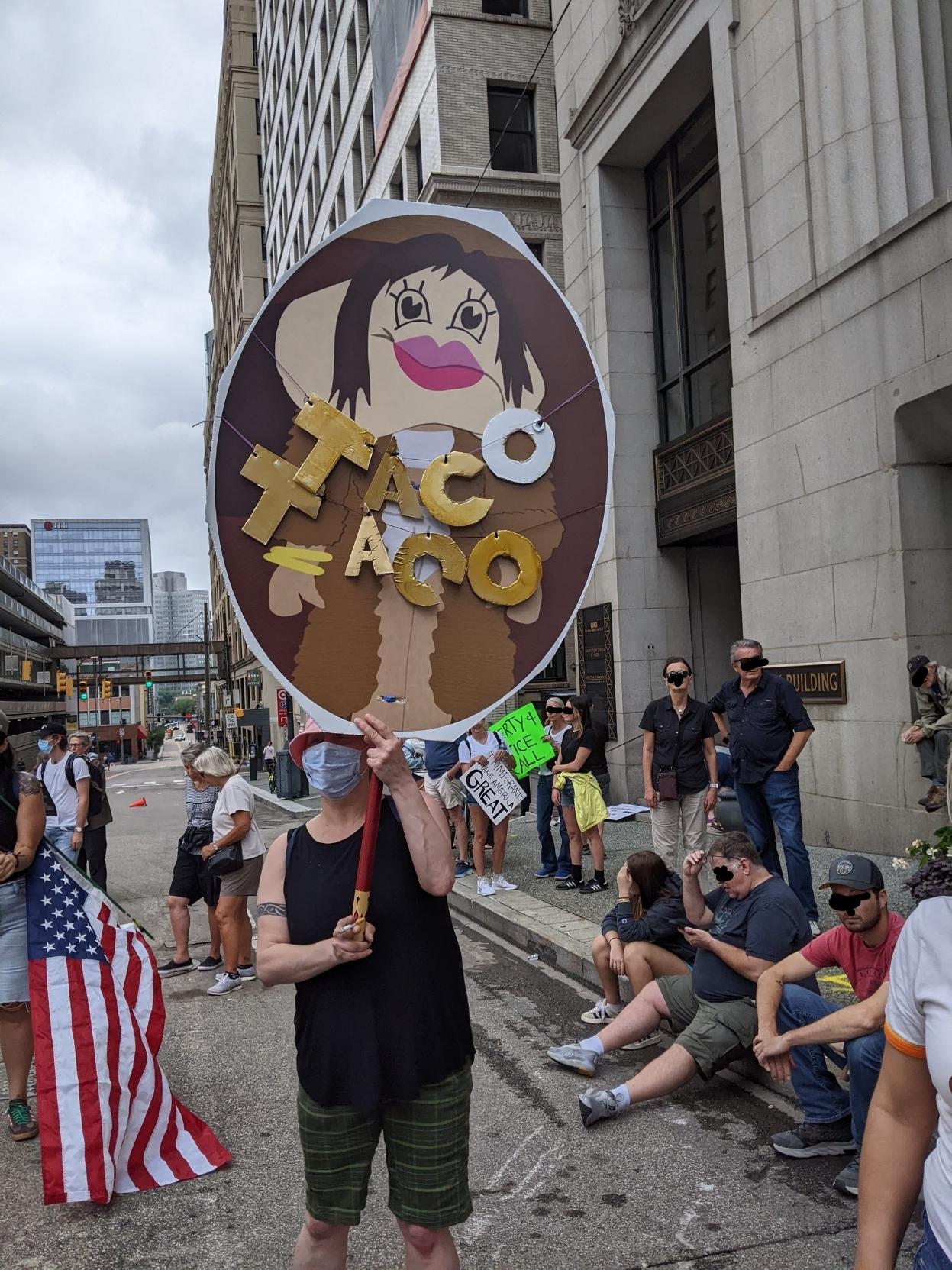 People in the crowd towards the back, some seated at the edge of the somewhat raised pavement , some standing on the road. One person with a mask and hat holding a big oval sign with a caricature of a chicken perhaps with big eyes and lipstick and letters cut out, painted in gold and strung across that spell TACO TACO