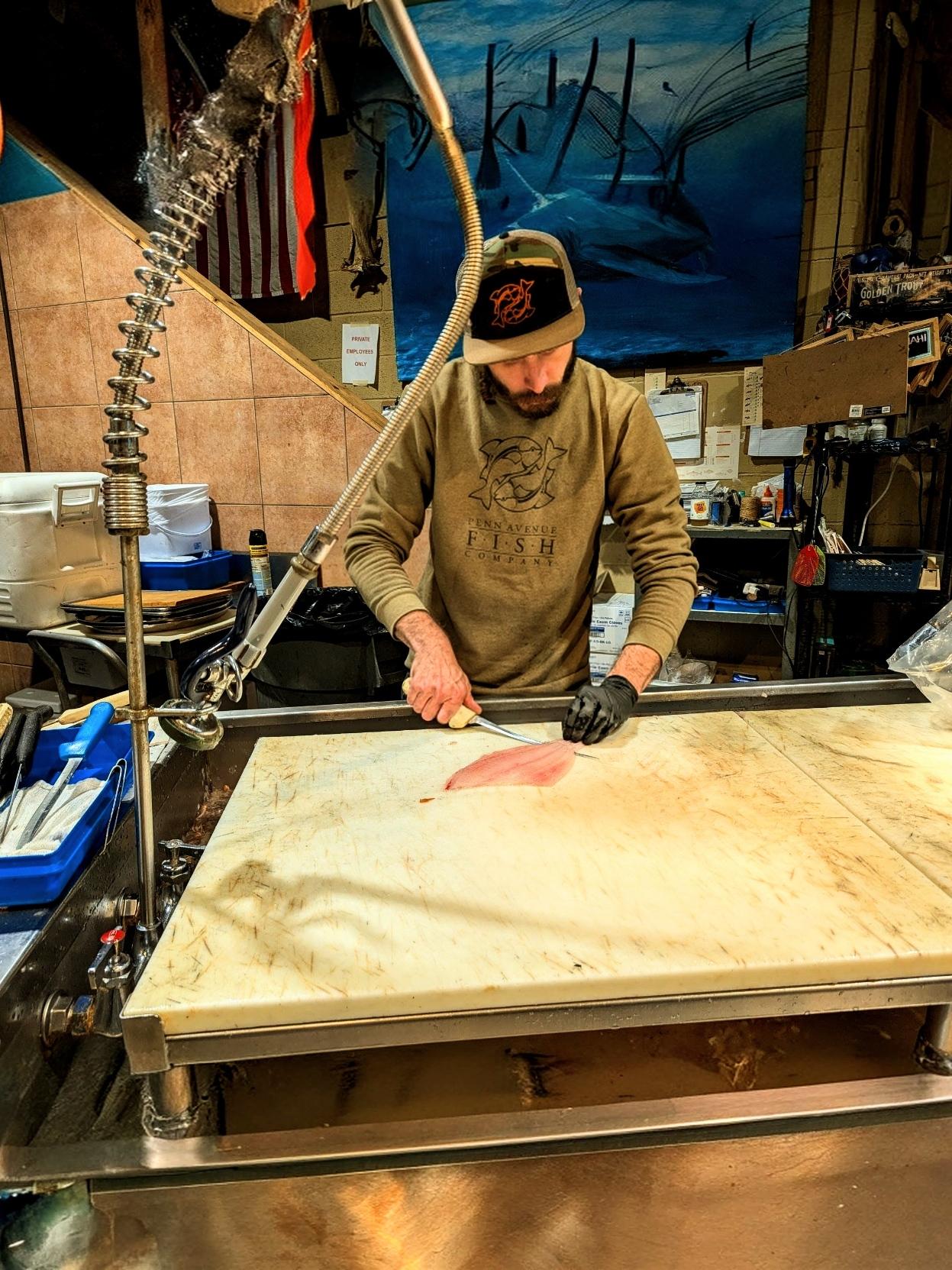 A huge cutting board area with a person in an olive green full sleeved sweatshirt and cap using a thin filleting knife to cut up a side of flounder