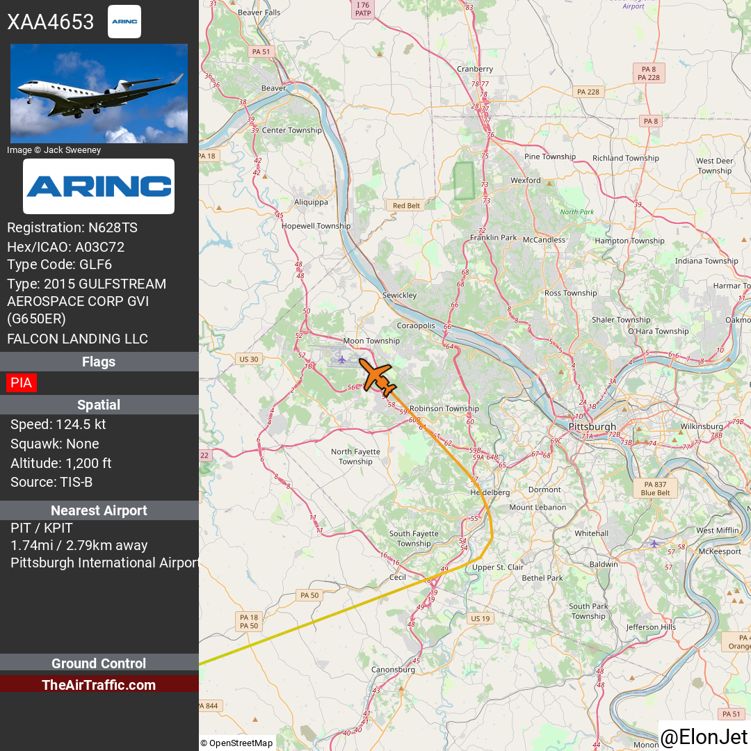 Landed near Pittsburgh, Pennsylvania, United States. Apx. flt. time 3 h 57 min.