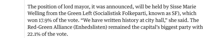 The position of lord mayor, it was announced, will be held by Sisse Marie Welling from the Green Left (Socialistisk Folkeparti, known as SF), which won 17.9% of the vote. “We have written history at city hall,” she said. The Red-Green Alliance (Enhedslisten) remained the capital’s biggest party with 22.1% of the vote.
