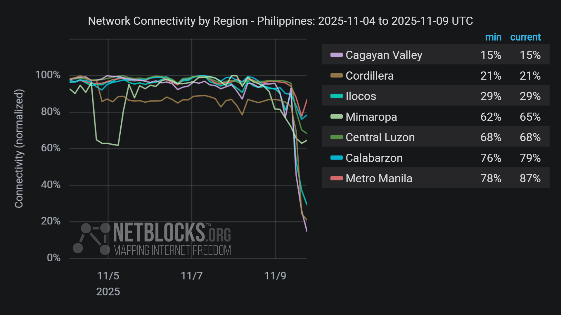 ⚠️ Confirmed: Metrics show a decline in internet connectivity in the northern #Philippines corresponding to the approach of Super Typhoon Fung-wong's landfall in Luzon; the new incident comes only days after Typhoon Kalmaegi knocks out power and telecom lines #UwanPH