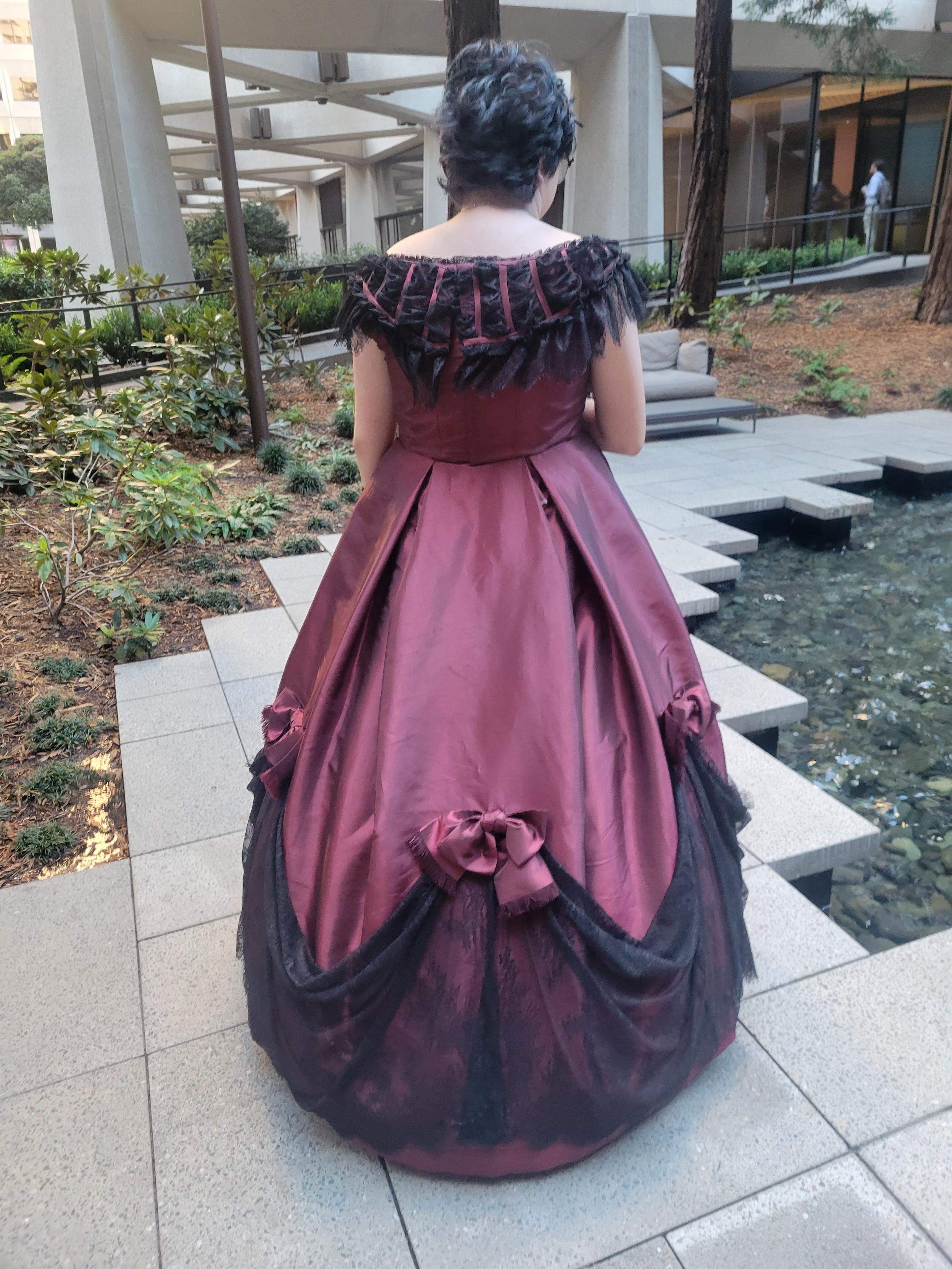 I copied a gown from 1865, but changed the colors to suit the "emo Victorian vibe" kiddo was going for. The changeable taffeta glows shocking red in the sunlight, but the black undertones come out otherwise.