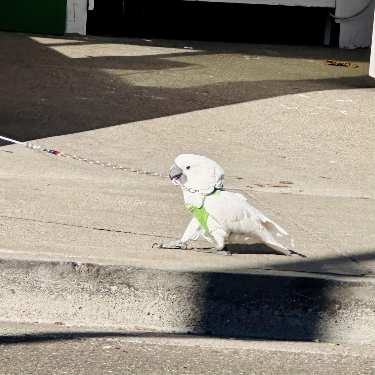 An elderly cockatoo out on a walk (his name is Casper. Cookie used to say hi to him)