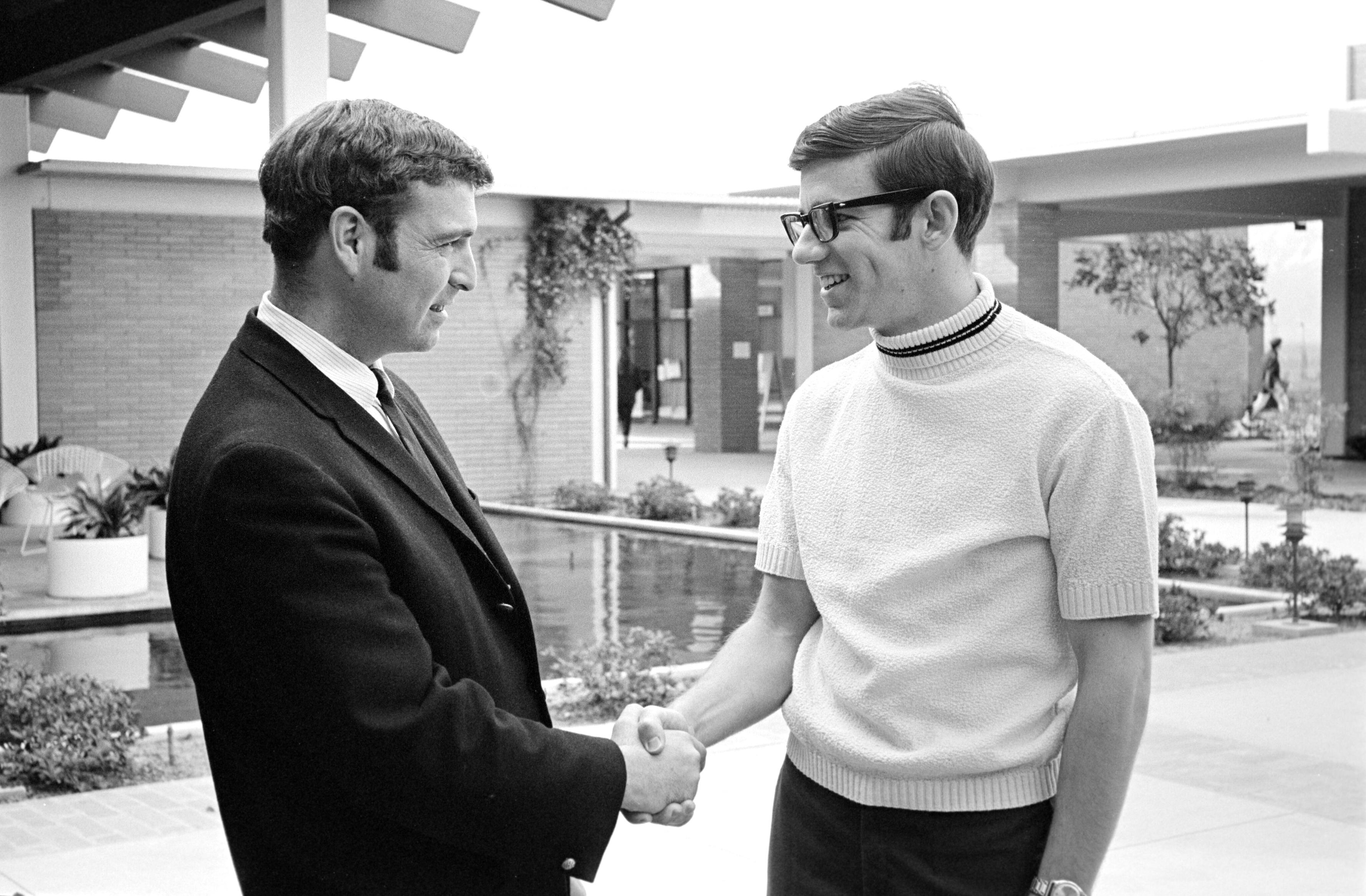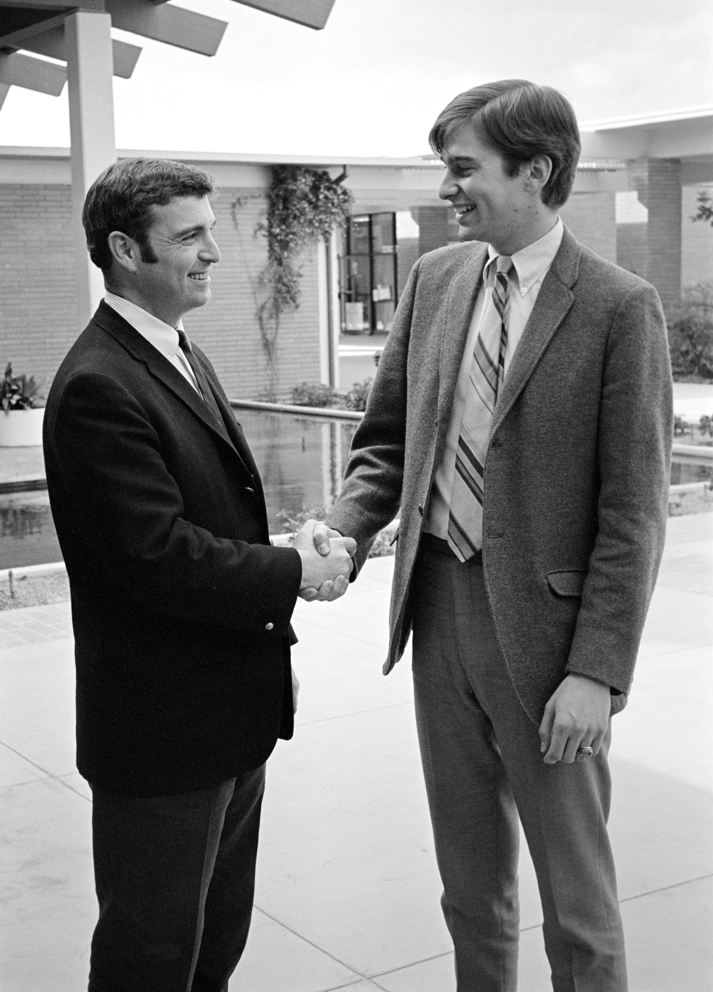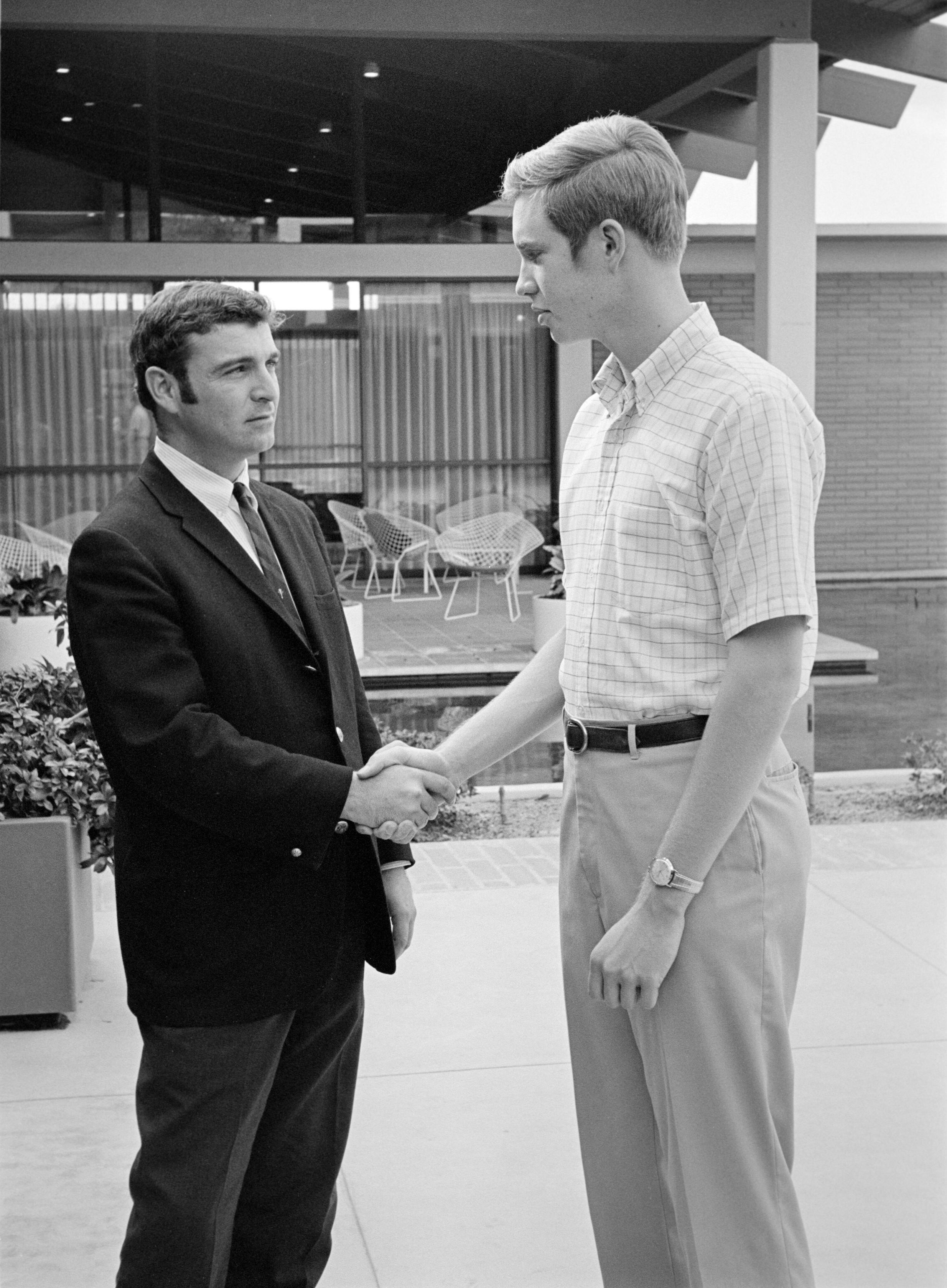 The office of the Dean of Students commissioned me to take photos of students receiving his congratulations for making the Dean's List. I'm posting this stupefyingly repetitive sequence today and tomorrow for historical reasons: it is a representative sample of the clothing styles that students of that time and place would choose for such an occasion.