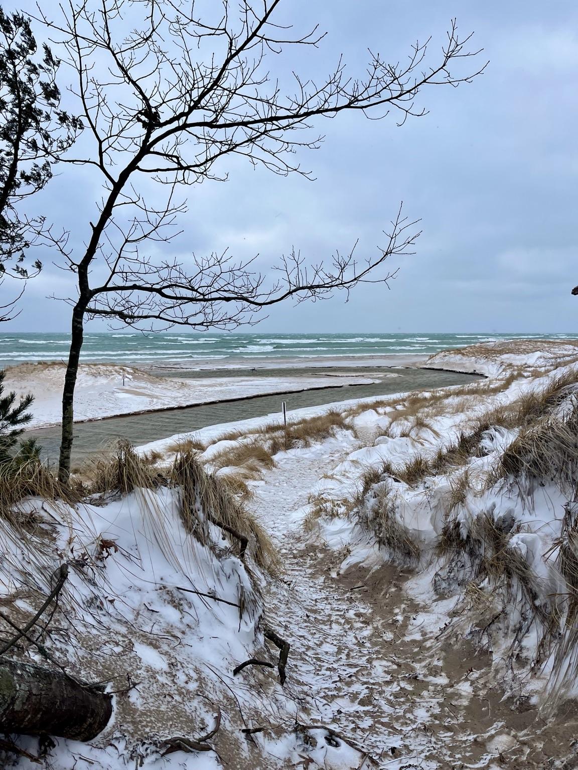 A path leads through snowy sand dunes and grass towards Lake Michigan with choppy waters under a cloudy sky. A leafless tree is visible on the left side of the image.