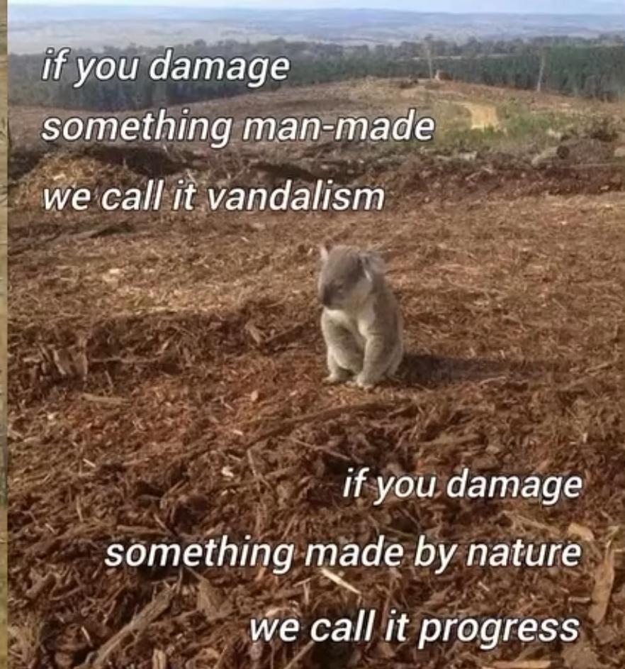 A coala bear is sitting in a burned or completely damaged landscape. Looks sad. text: if you damage something man-made we call it vandalism. If you damage something made by nature we call it progress.