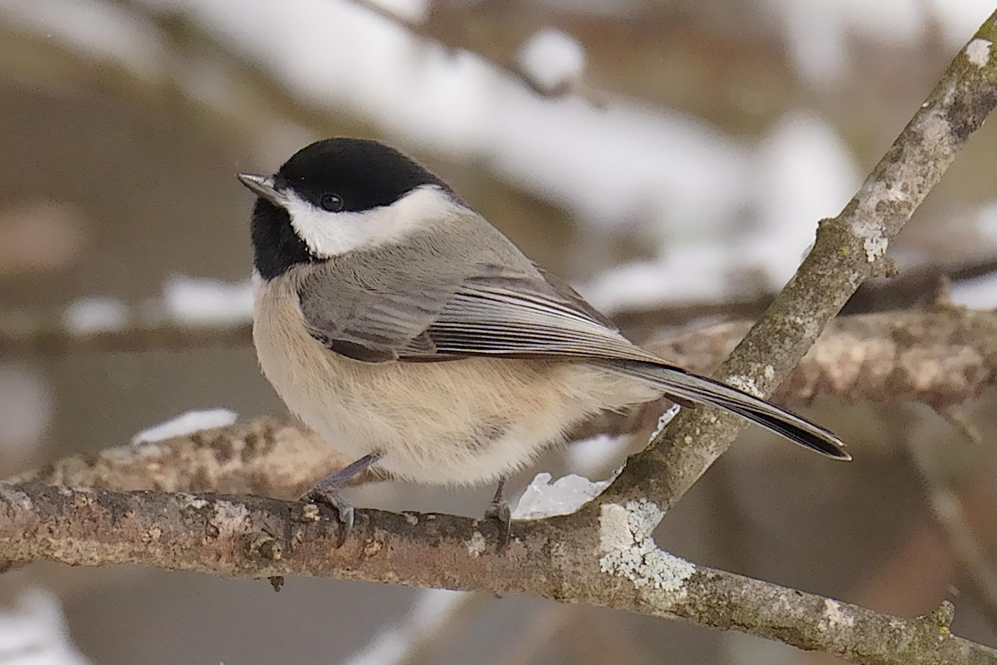 On a cloudy day, a Carolina Chickadee perches in profile on a thin, partially snow-covered branch.