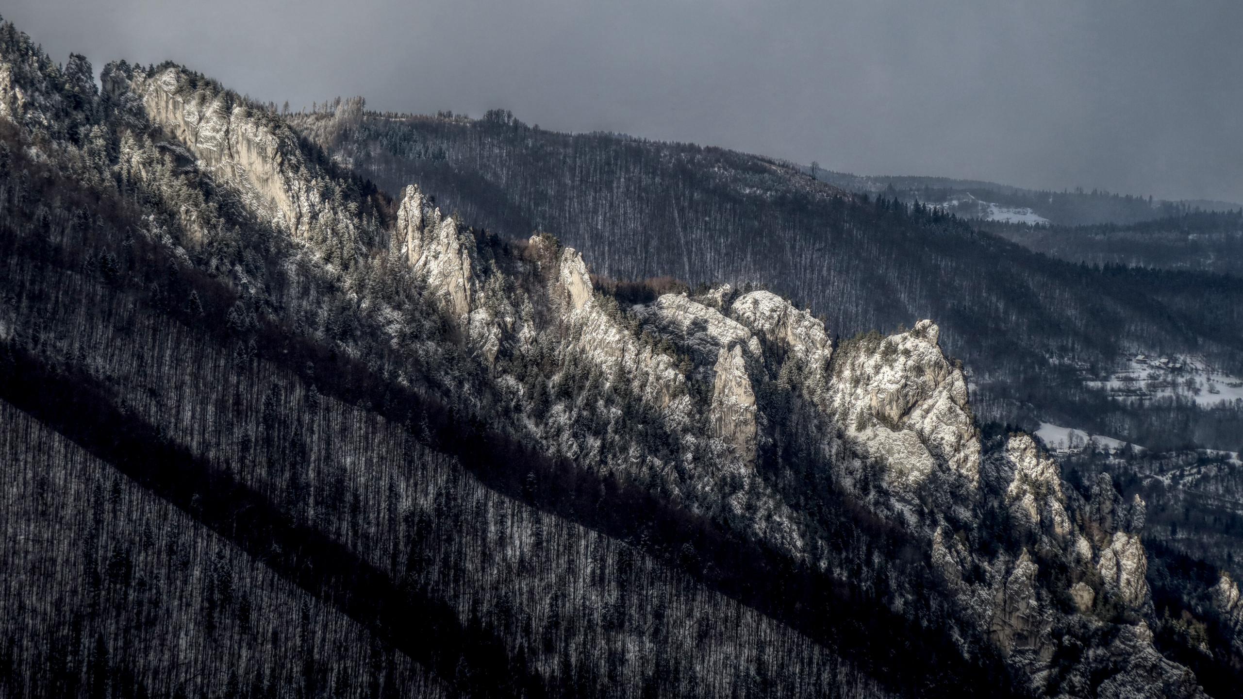 Overcast winter afternoon photo of a forest-covered hillside with some high steep rock formations. Everything is in shadows from the thick clouds except for the rocks lit by the sun.