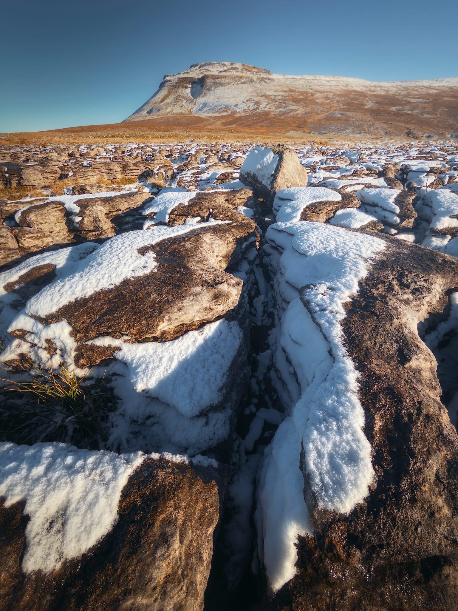 Two tall, weathered limestone uprights stand sentinel on Crina Bottom's pavement, their pale grey surfaces streaked with darker lichen and oxidation marks, leaning slightly towards one another across a narrow gap that frames a smaller wedge-shaped stone between them, creating a dramatic sculptural composition emphasising the raw power of frost-shattered limestone; the bases and surrounding ground are clothed in vibrant moss and low vegetation in shades of lime-green and golden-yellow, with scattered smaller blocks of weathered stone embedded in the verdant carpet, whilst the background reveals the characteristic jumbled limestone pavement stretching away beneath clear blue sky, dotted with numerous boulders and exposed stone surfaces weathered to pale cream and grey; distant walkers can be glimpsed traversing the moorland beyond, and Ingleborough's frost-capped slopes rise hazily on the horizon, anchoring this intimate detail within the broader alpine landscape, where the interplay of sharp winter sunlight, cool limestone geometry, and warm moss creates a composition of striking textural and tonal contrast that speaks to the slow geological processes that have shaped this distinctive Pennine terrain.