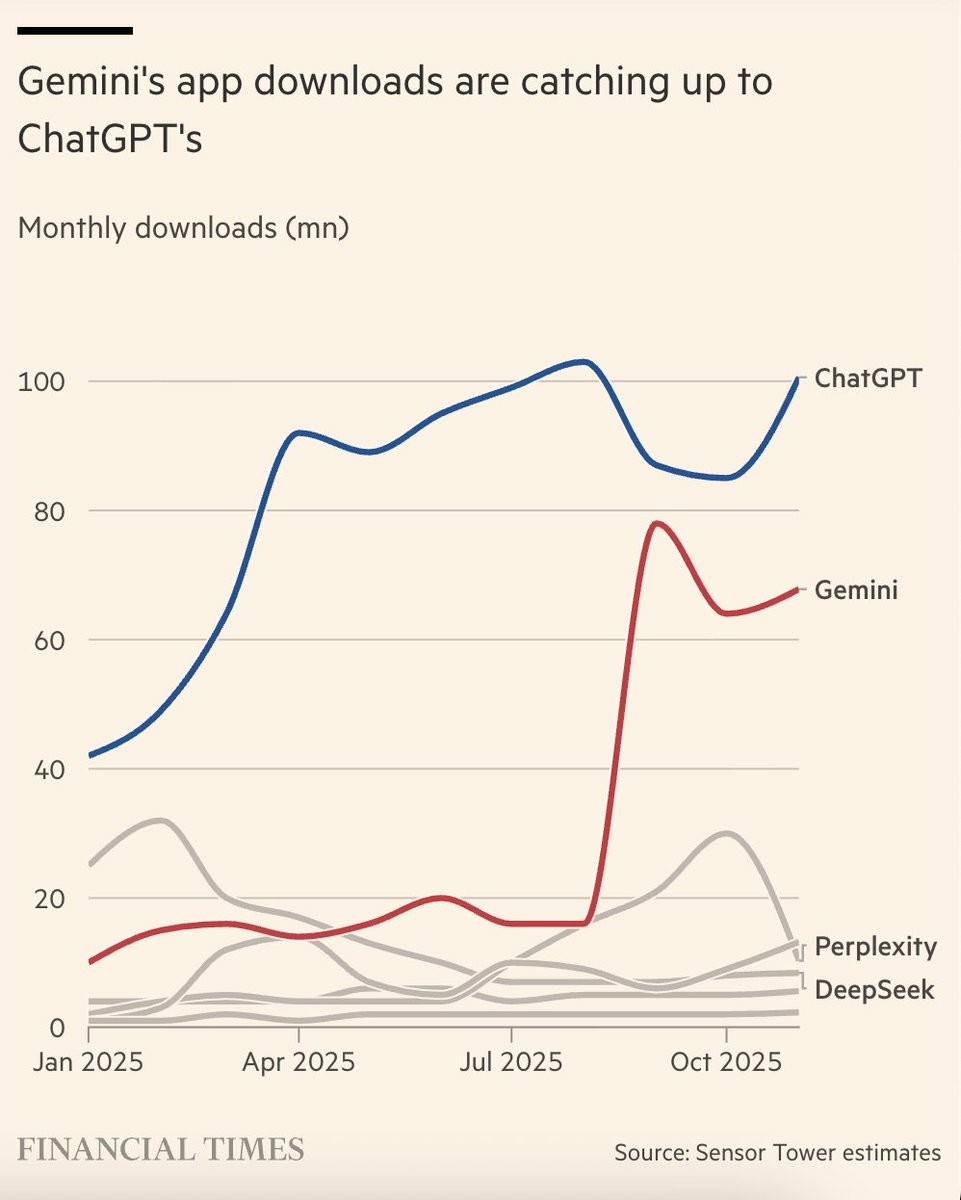 Gemini is catching up to ChatGPT in downloads, with 100.8 million compared to 67.8 million in November, per FT: