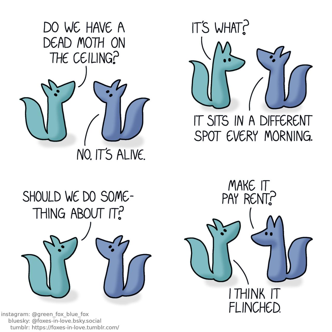 A comic of two foxes, one of whom is blue, the other is green. In this one, Blue and Green are returning home after a bike ride, walking their bicycles to the door. There's a note taped to the door. Blue glares at an empty spot beside the door. Blue: Hey! They've removed the doorstopper stone! Holding the door open so that Green can walk his bike in first, Blue reads the note on the door, frowning at it. Blue: "Do not use anything to prop the door open" so how should people get their bikes in? Having put their bikes and helmets back in their place, Blue and Green march on with determination. Blue: Let's get some paper and a pen. Green: And a new rock? Blue: Naturally. Returning outside, Blue and Green observe the new note that they have taped on top of the old one. Blue glances to Green with a question. They have also retrieved a new rock to replace the old one, placing it in the exact same empty spot beside the door, from where the old one had been removed. Blue: "The rocks will continue until a better alternative is provided." Is that too harsh? Green: Could be harsher.