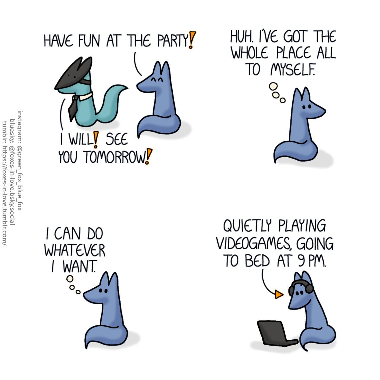 A comic of two foxes, one of whom is blue, the other is green. In this one, Blue and Green are in bed. Blue is sound asleep, as Green wakes up to a prolonged, high-pitched, continuous eeee-sound. Green, thinking: Wait, what's that sound? A child screaming? Outside, this late at night?  Frowning and sleepy, Green lifts his head from his pillow and looks around, trying to determine the source of the sound. Green, still in thought: There it was again. Where is it coming from?  As he looks around, Green's gaze lands on Blue. Still groggy and sleepy, Green nonetheless looks visibly relieved. Green, still thinking: I can't decide what to do about it before I figure out wh- oh.  Green cuddles up to Blue, who is still just as serenly asleep as ever. The whistling sound continues, coming from Blue. Green, still in thought: It was just your nostril whistling.