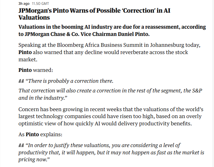 3hago 11.50 GMT JPMorgan's Pinto Warns of Possible ‘Correction’ in Al Valuations Valuations in the booming Al industry are due for a reassessment, according to JPMorgan Chase & Co. Vice Chairman Daniel Pinto. Speaking at the Bloomberg Africa Business Summit in Johannesburg today, Pinto also warned that any decline would reverberate across the stock market. Pinto warned: 44 “There is probably a correction there. That correction will also create a correction in the rest of the segment, the S&P and in the industry.” Concern has been growing in recent weeks that the valuations of the world’s largest technology companies could have risen too high, based on an overly optimistic view of how quickly Al would delivery productivity benefits. As Pinto explains: 44 “In order to justify these valuations, you are considering a level of productivity that, it will happen, but it may not happen as fast as the market is pricing now.”