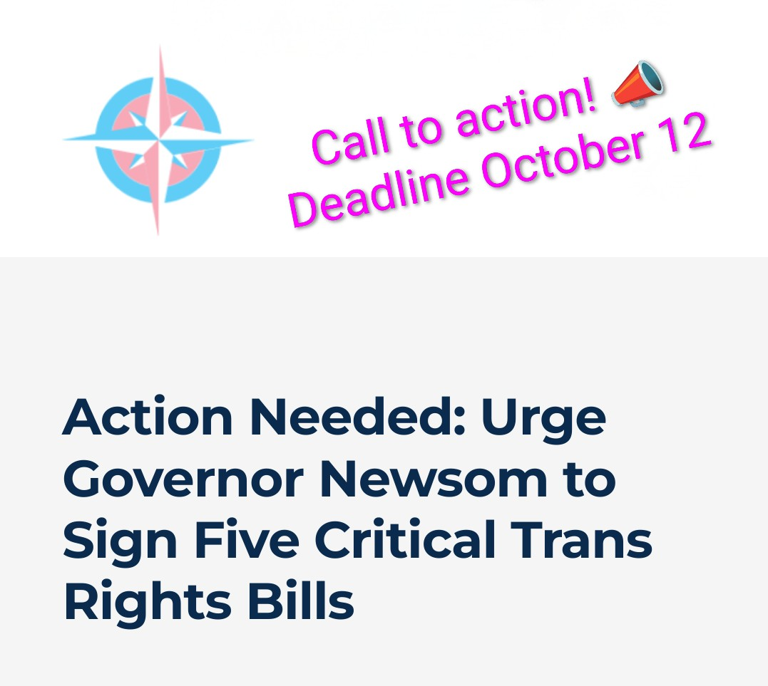 The deadline is coming up quickly. More info on the bills at https://transfamilysos.org/action-needed-urge-governor-newsom-to-sign-five-critical-trans-rights-bills/
