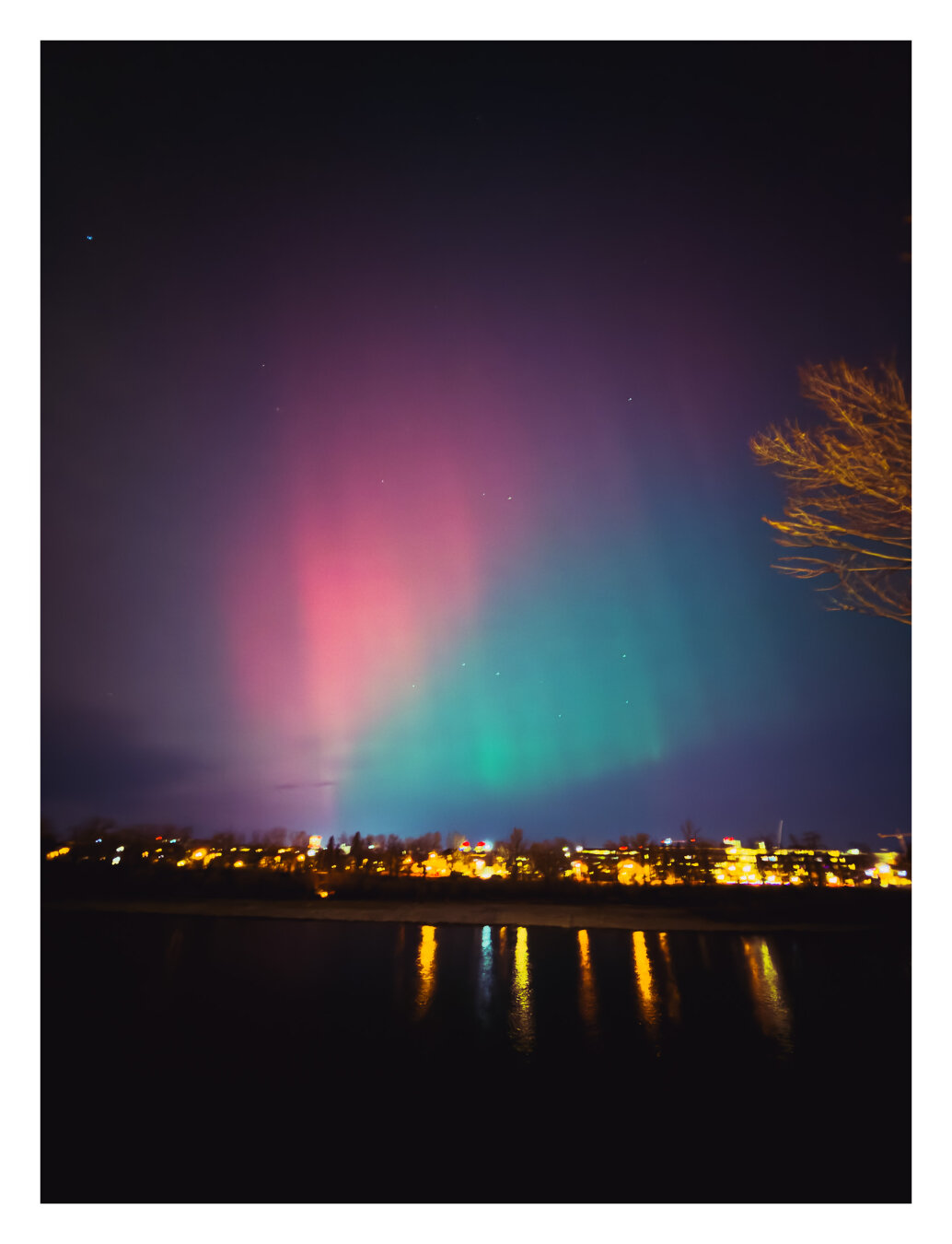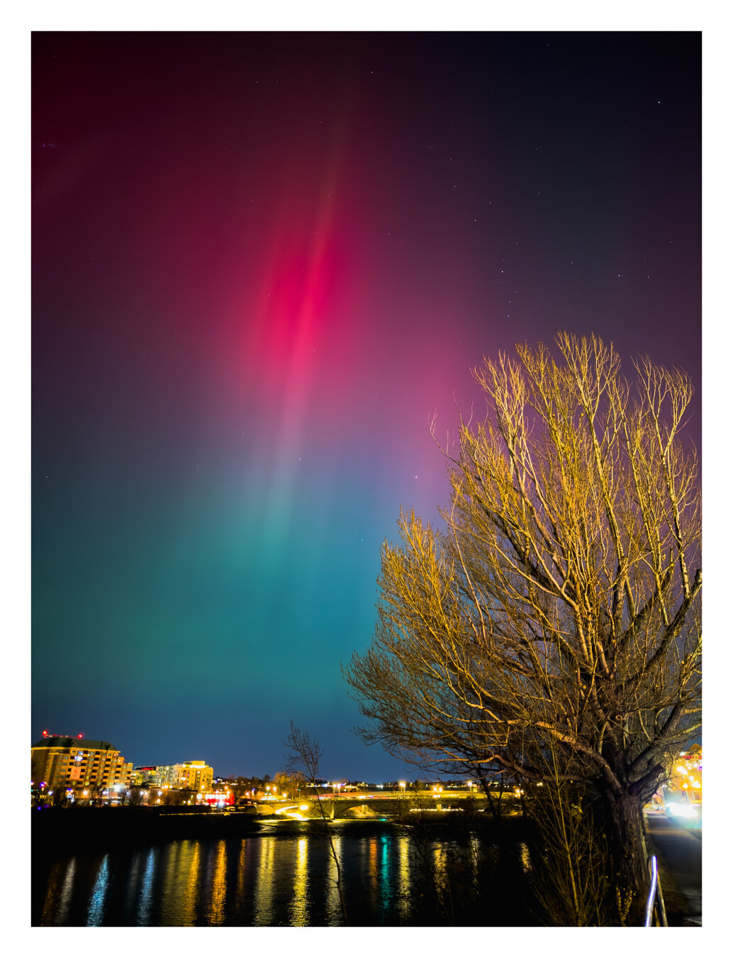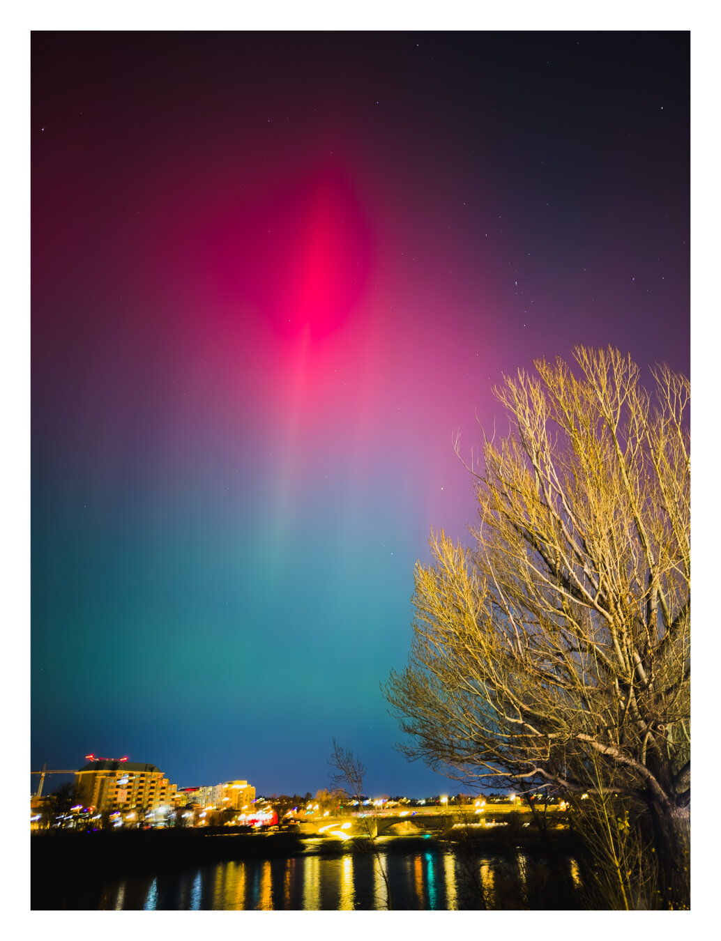Vertical image of red and green aurora appearing above a dense stand of snow-covered spruce and birch trees. Faint beams of aurora stretch upward toward the stars. The foreground trees are coated with fresh snow, and dark branches frame the top and sides of the image.