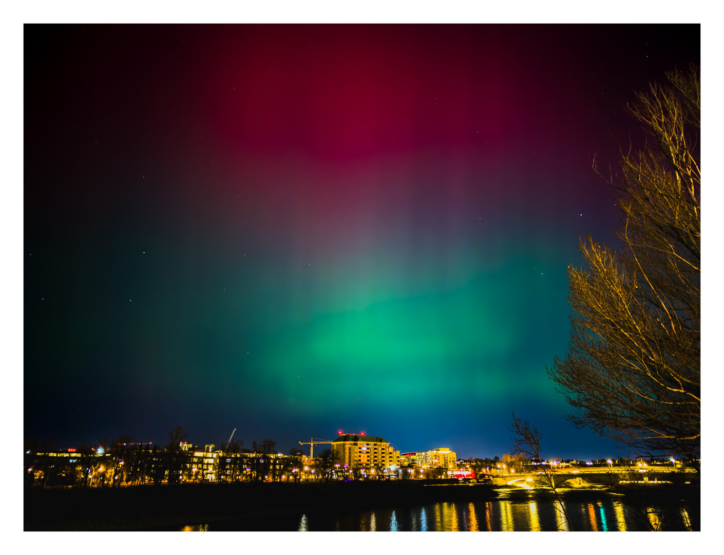 Vertical photograph of red and green aurora overhead, viewed between tall spruce trees laden with snow. The aurora forms a wide fan shape spreading outward from a point near the horizon, with streaks of red dominating the center and green along the edges. Stars are visible through the aurora.