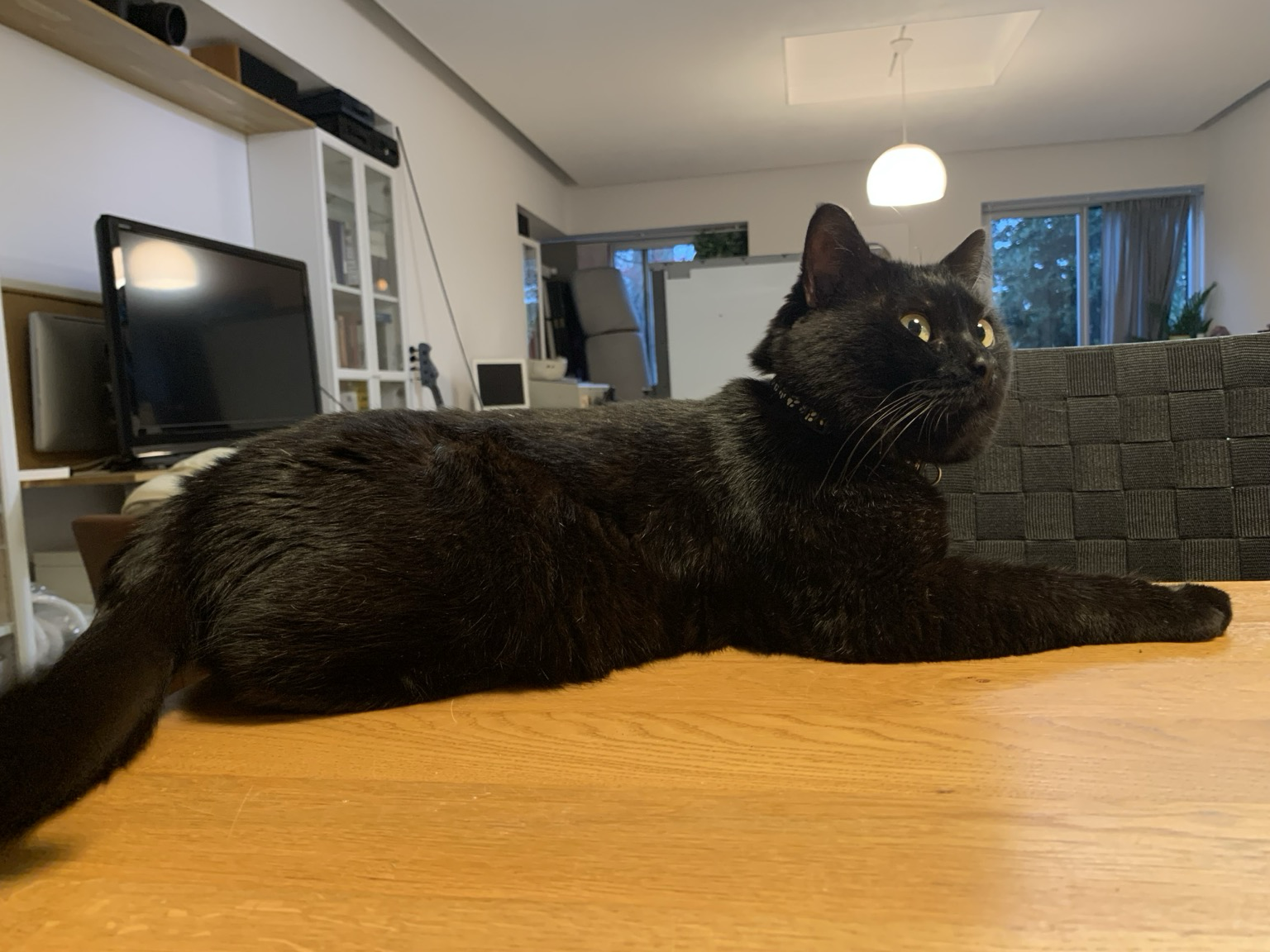 A poorly-lit shot of Gracie mid-grooming. HOW DOES ONE CAT HAVE THAT MUCH TAIL? #CatsOfMastodon