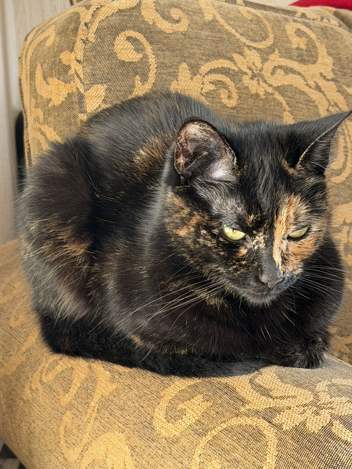 Lady Mischief, inquiring with her eyes, "will you please give me a greenie?" Trying to wean her off Temptations and get her to eat slightly better quality snackies! #caturday #cats #catsofMastodon #catsofFediverse #blackcat