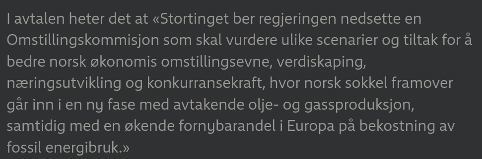 Historisk avtale om at Norge endelig – ENDELIG – skal se det faktum at oljealderen er på hell i øynene og begynne å planlegge for hvordan denne utrolig krevende overgangen skal kunne gjøres på en minst mulig smertefull måte!