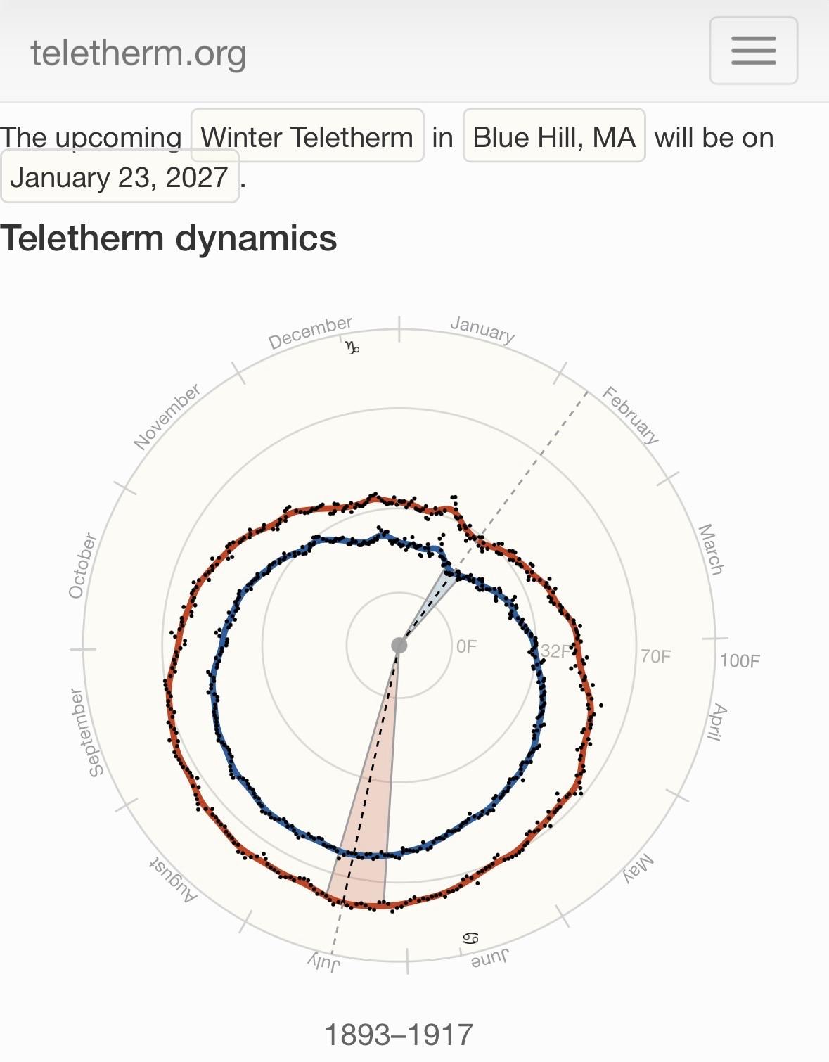 Many people track when the winter solstice is (“the days only get longer from here!”) but you may not know what your local *teletherm* is (“the days only get warmer from here!”). For us here in Boston the winter teletherm is around January 23rd. Where I used to live in Vermont it was right around Groundhog Day. It’s certainly a time for celebration! ☀️ You can find your city’s teletherm here if you know the nearest weather station: http://teletherm.org/index.html?window=25&var=summer_day&year=1960&cityID=190736 #BostonMA #dataviz #weather #wx #winter