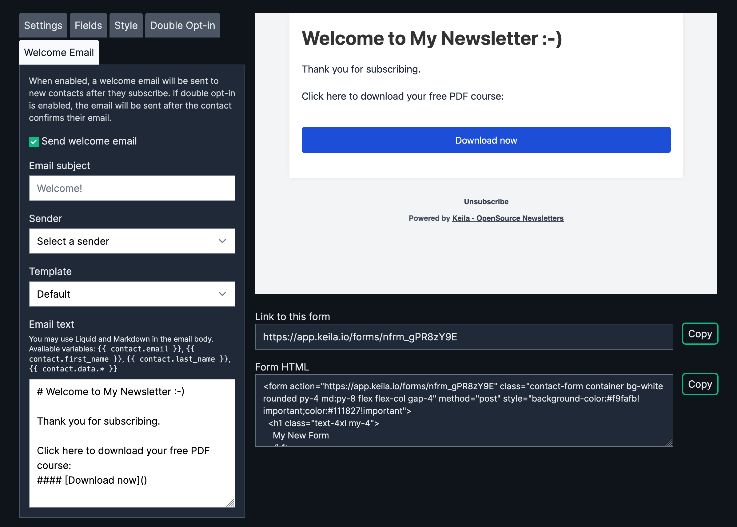 Now live on Keila Cloud: Configure welcome emails for your newsletter signup forms. A great way to offer free downloads or discount codes for new subscribers!
