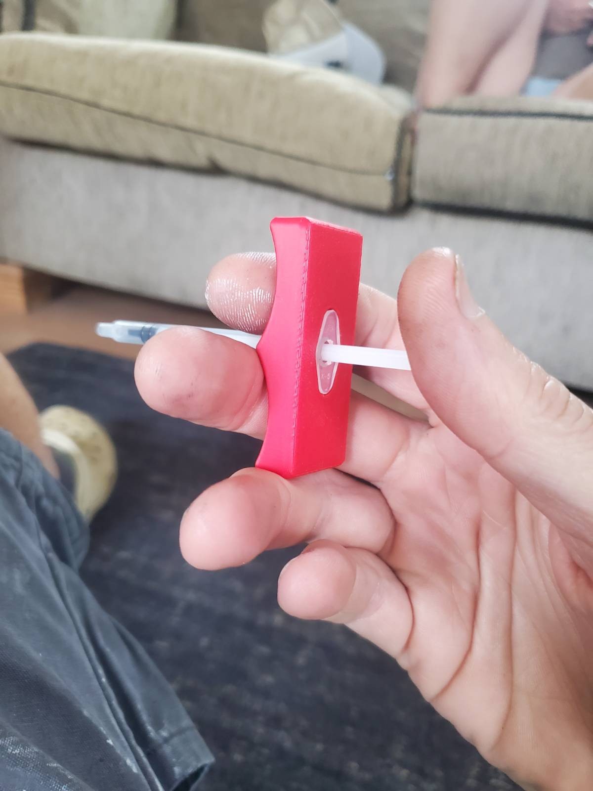 My syringe helper. If you're dispensing a thick goo the syringe body can slip through your fingers. Not so with the helper in place!