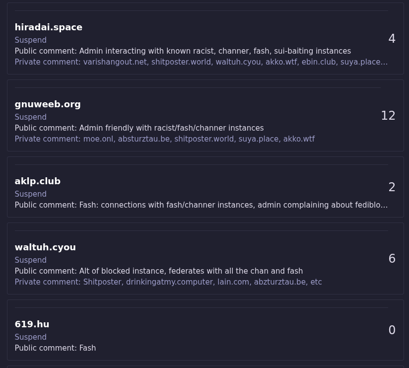 (Also add: fops.cloud, admin interactions with lea.pet, soykaf.com, outerheaven.club, raccoon.quest, shitposter.world, dirtyknight.life, gabboman.xyz, waifuism.life, lain.com)