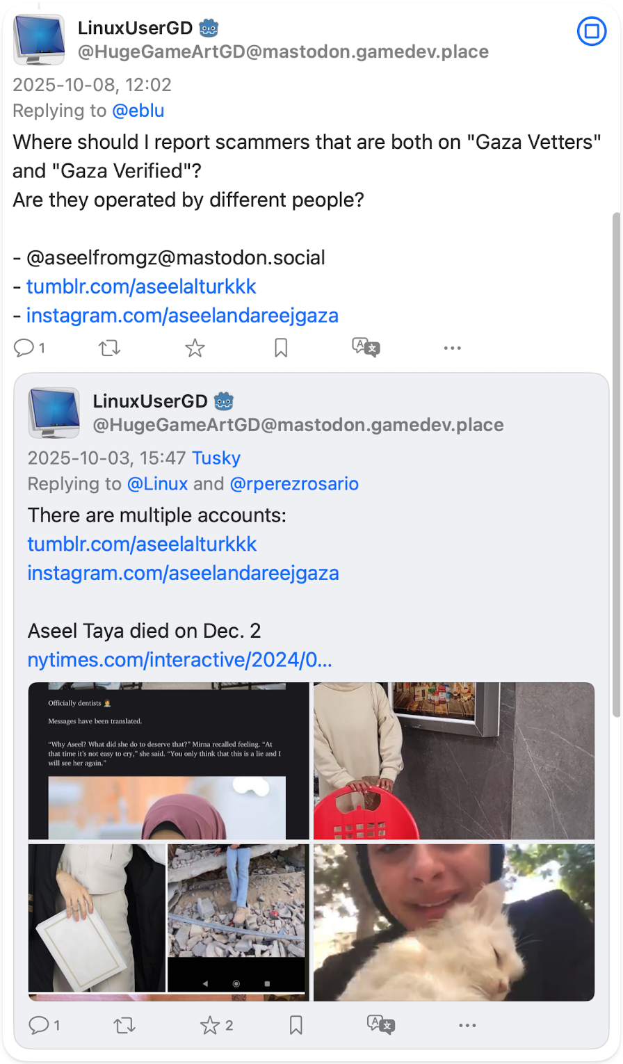 A post by LinuxUserGD with two photos of a young Palestinian woman who allegedly died as well as two of Aseel Alturk, who is alive and well and helping us as part of the Gaza Verified team. One of the photos chosen of Aseel Alturk is a still from her video where she is mourning her dead cat, Liza.