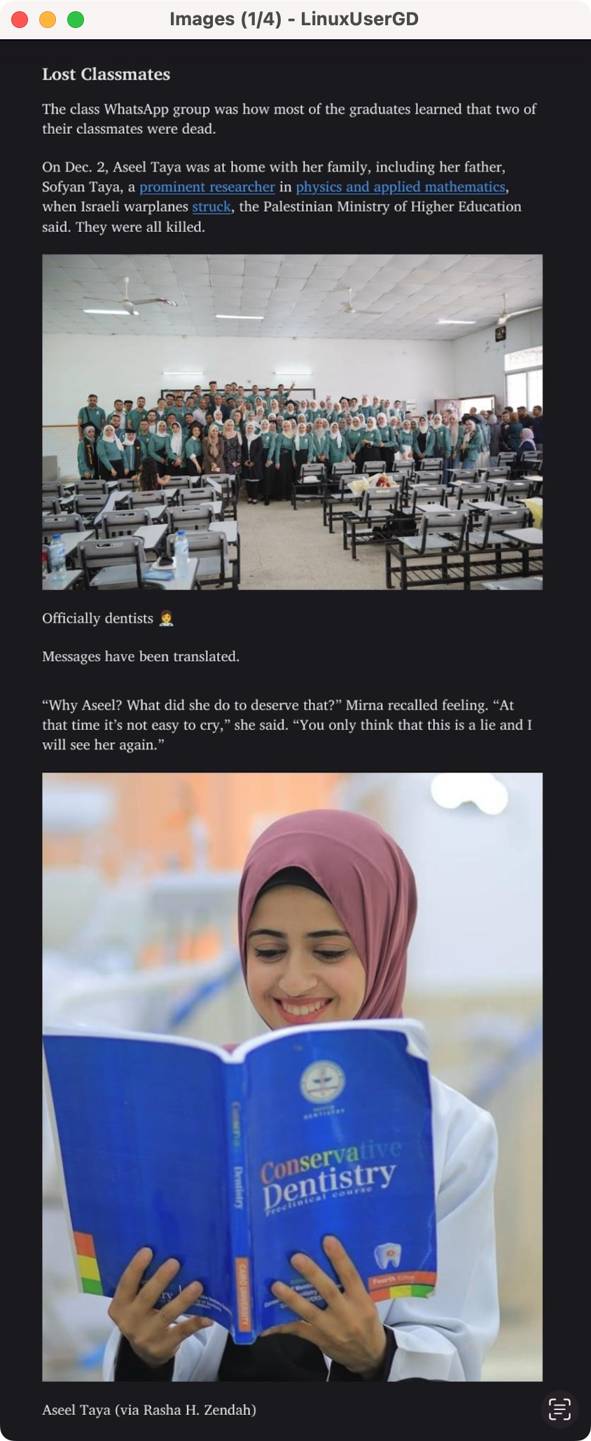 Screenshot of article about lost classmates with photo of a young Palestinian woman (Aseel Taya) who reportedly died. Lost Classmates The class WhatsApp group was how most of the graduates learned that two of their classmates were dead. On Dec. 2, Aseel Taya was at home with her family, including her father, Sofyan Taya, a prominent researcher in physics and applied mathematics, when Israeli warplanes struck, the Palestinian Ministry of Higher Education said. They were all killed. Officially dentists Messages have been translated. "Why Aseel? What did she do to deserve that?" Mirna recalled feeling. "At that time it's not easy to cry," she said. "You only think that this is a lie and I will see her again." Conservative Dentistry course Aseel Taya (via Rasha H. Zendah)