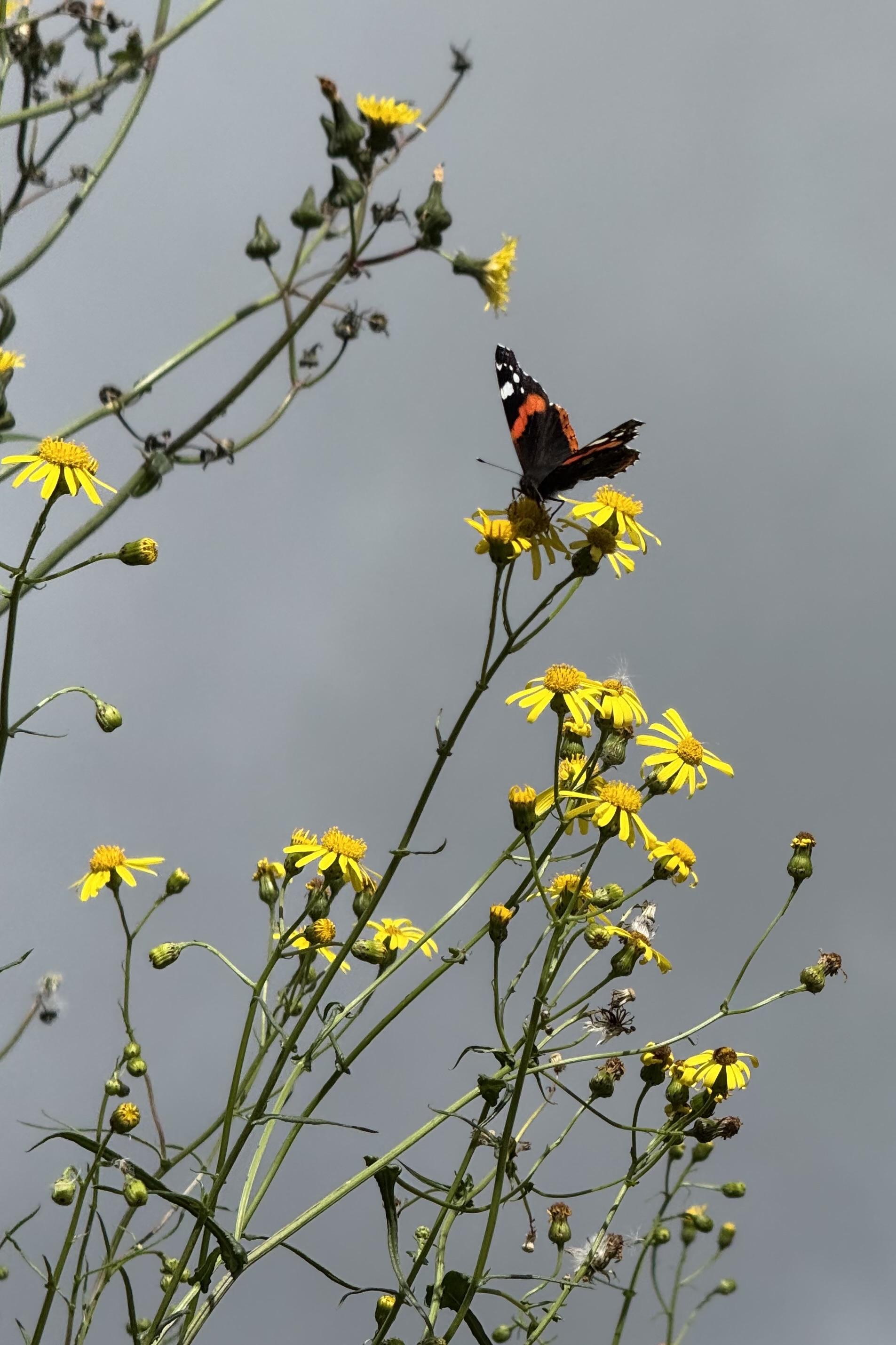 A Red Admiral #butterfly on Narrow-leaved Ragwort flowers against some ominous grey clouds. #Bloomscrolling