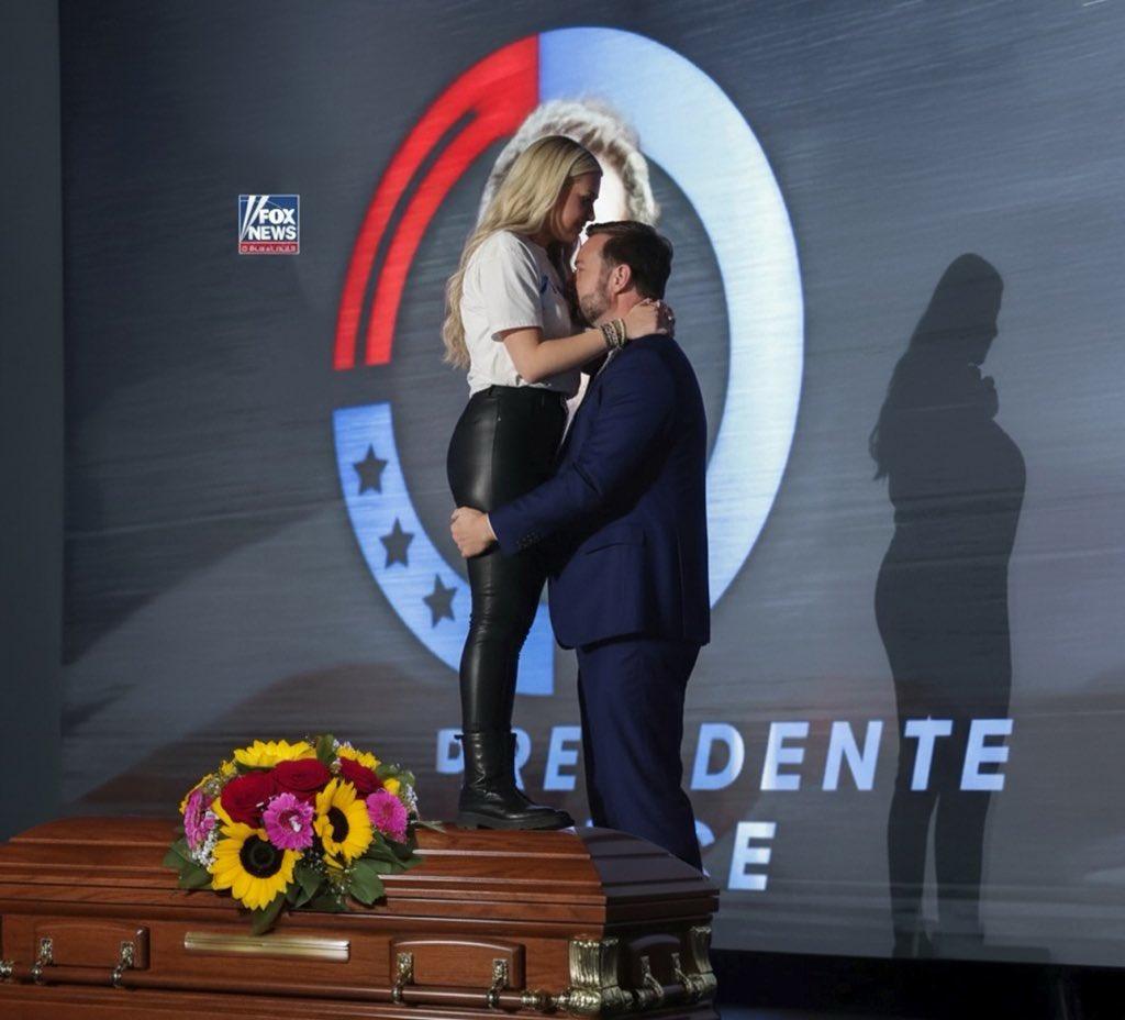 This picture has been viewed 21 million times on Musk's #disinformation platform. It appears to show JD Vance intimitly hugging Erika Kirk who is standing on the casket of her late husband, right wing debater Charlie Kirk.