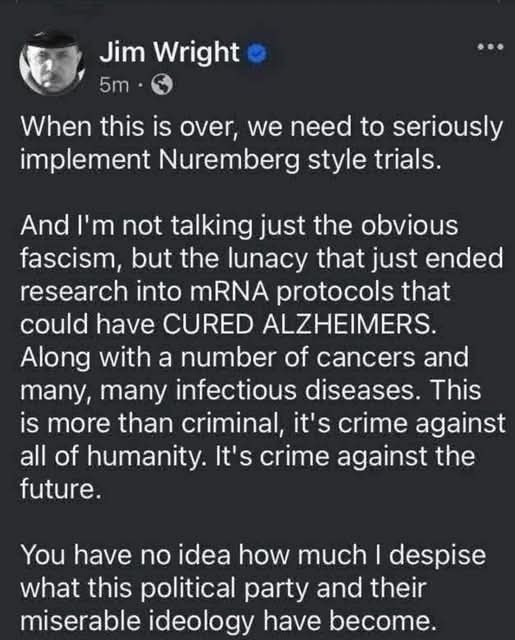 Jim Wright When this is over, we need to seriously implement Nuremberg style trials. And I'm not talking just the obvious fascism, but the lunacy that just ended research into mRNA protocols that could have CURED ALZHEIMERS. Along with a number of cancers and many, many infectious diseases. This is more than criminal, it's crime against all of humanity. It's crime against the future. You have no idea how much | despise what this political party and their miserable ideology have become.