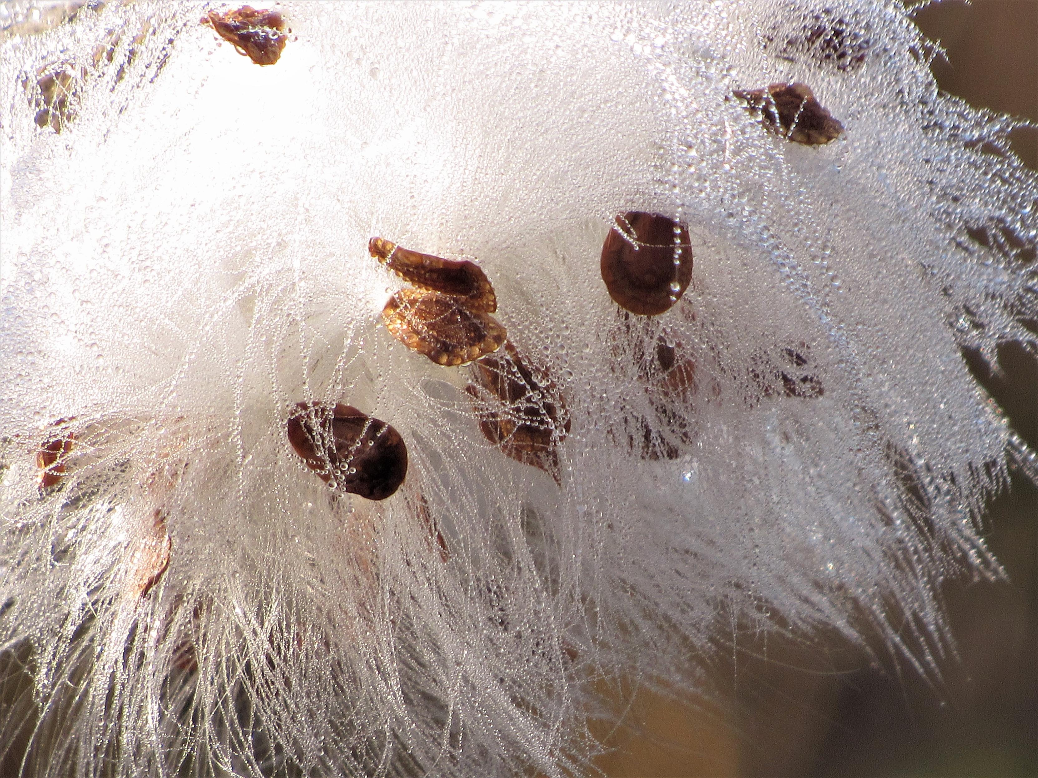 Closeup of the silky fluff of milkweed seeds laden with dewdrops.