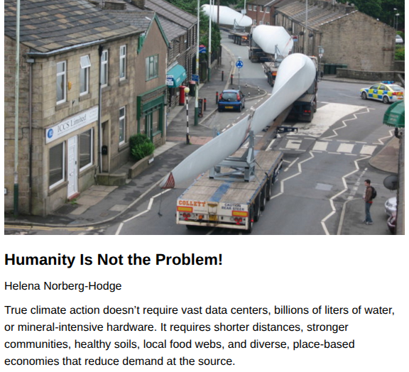 "We do need some renewables. But the ‘transition’ must be radically reframed. We must not start by asking “how do we transition the current global economy to renewable energy” – that proposition is a death sentence. We must start by asking “what are our real human energy needs, and how do we meet them in the wisest way possible?” In other words, what are the needs of thriving local economies."