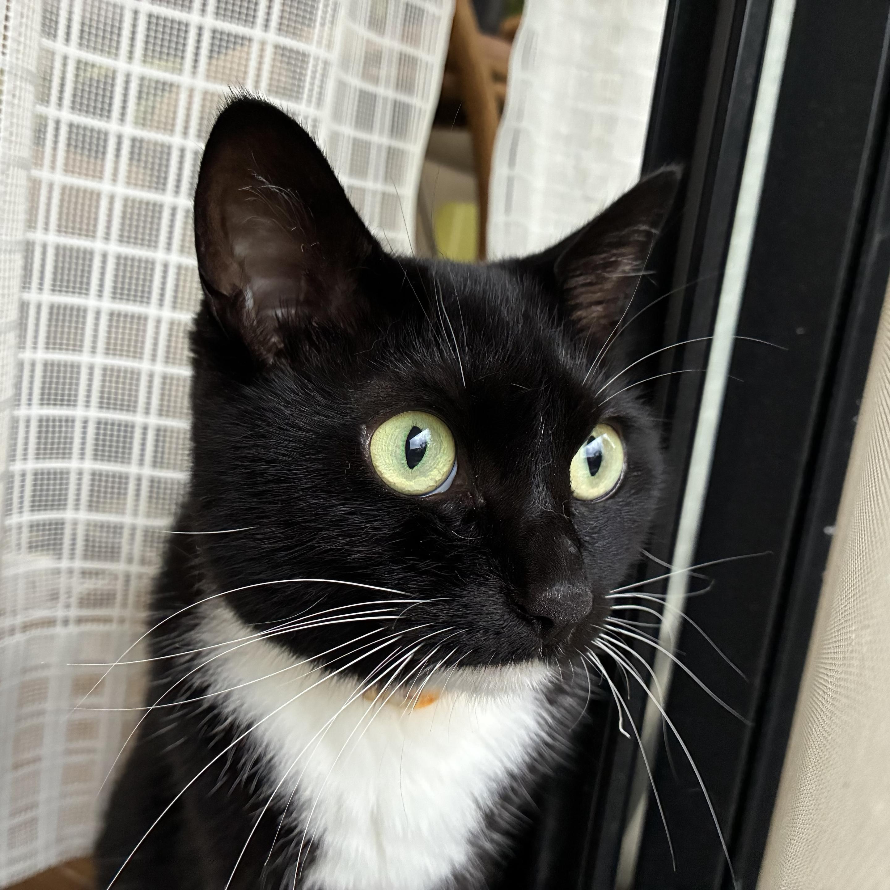 A close-up of a black and white cat, set against a backdrop of a sheer curtain.