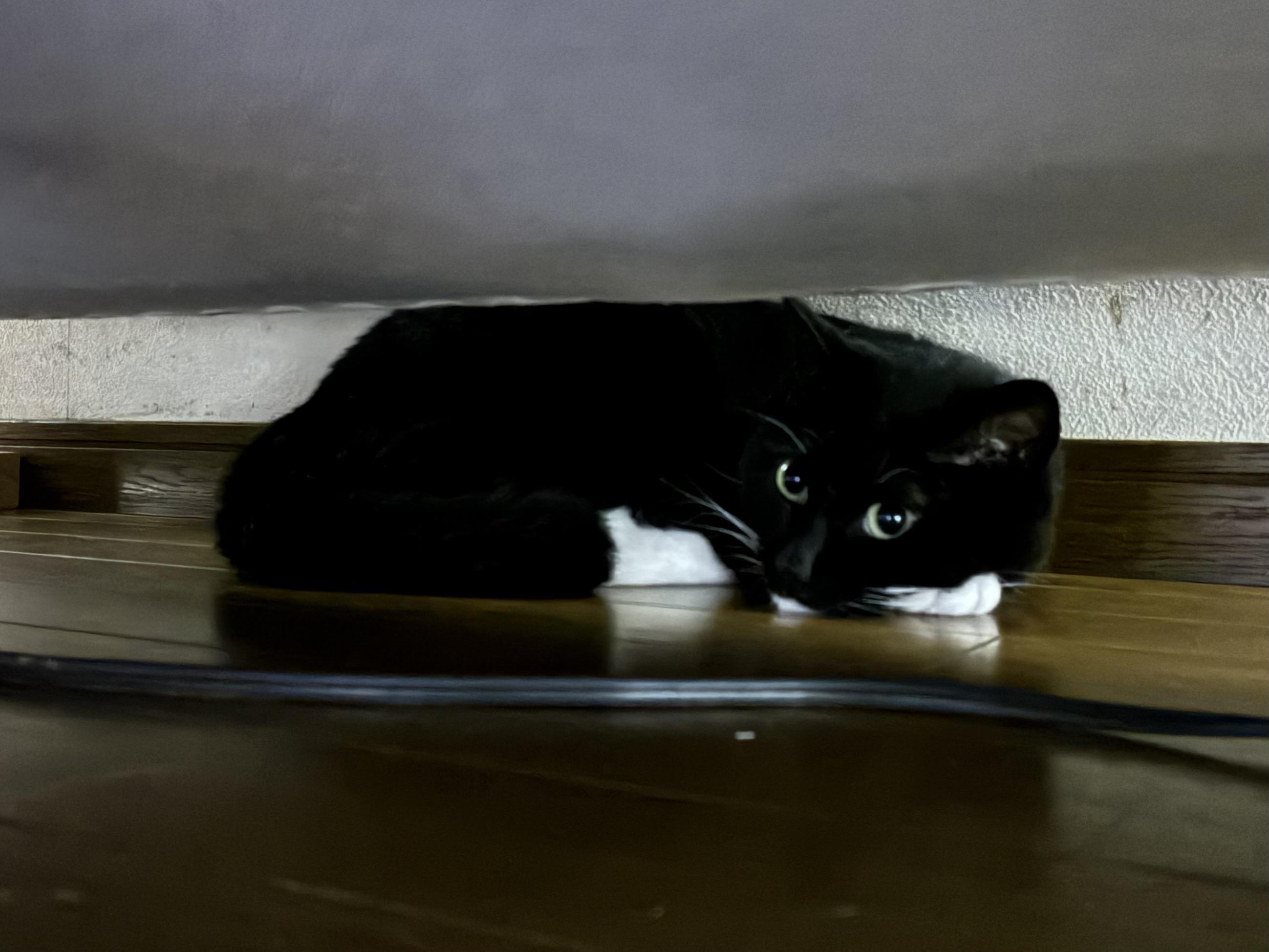 A black and white cat lies curled up on a wooden floor, partially hidden under a furniture.