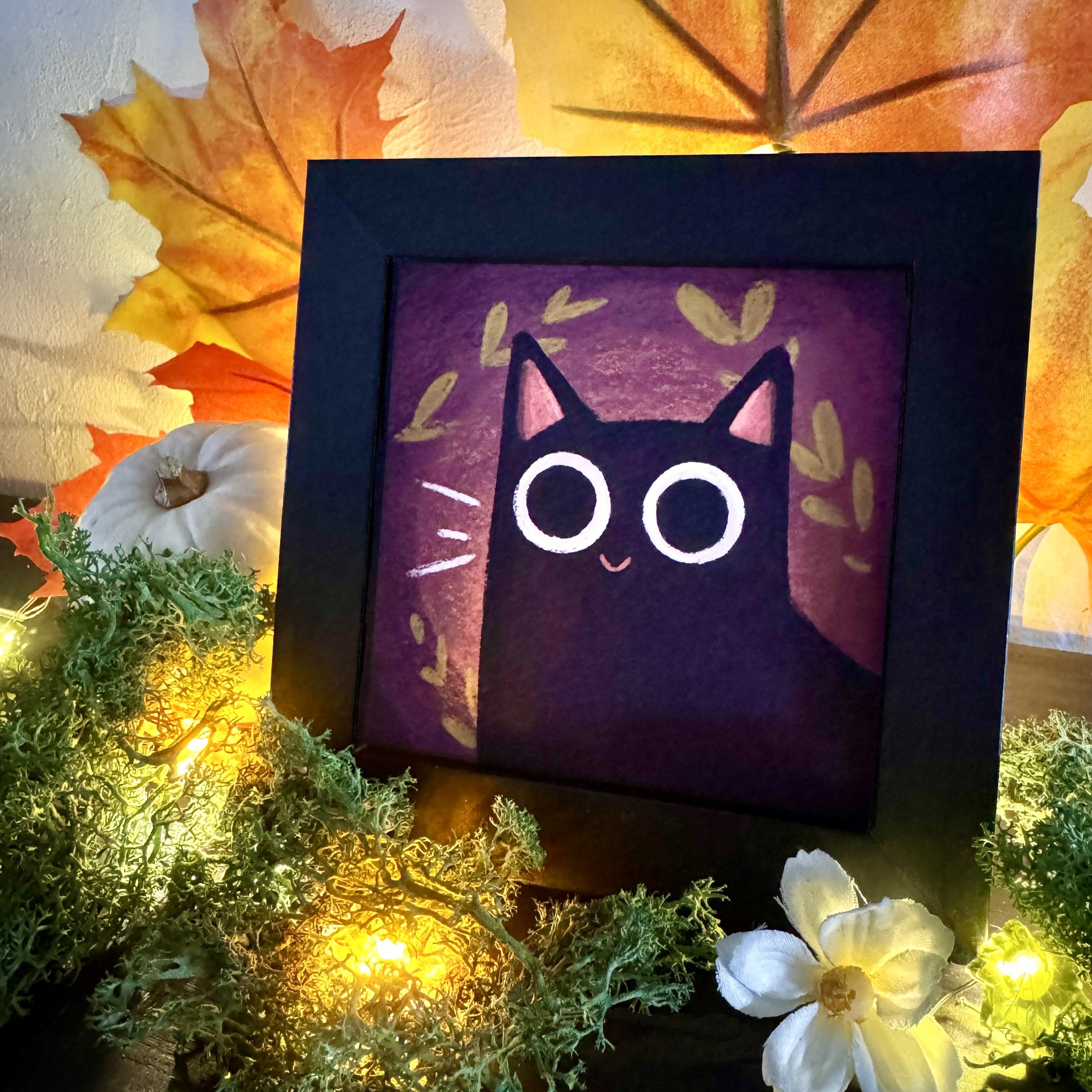 A small square illustration featuring a black cat’s face on a dark purple background. The cat has really big, round eyes. The print is framed in black and surrounded with moss, fairy lights and red maple leaves.