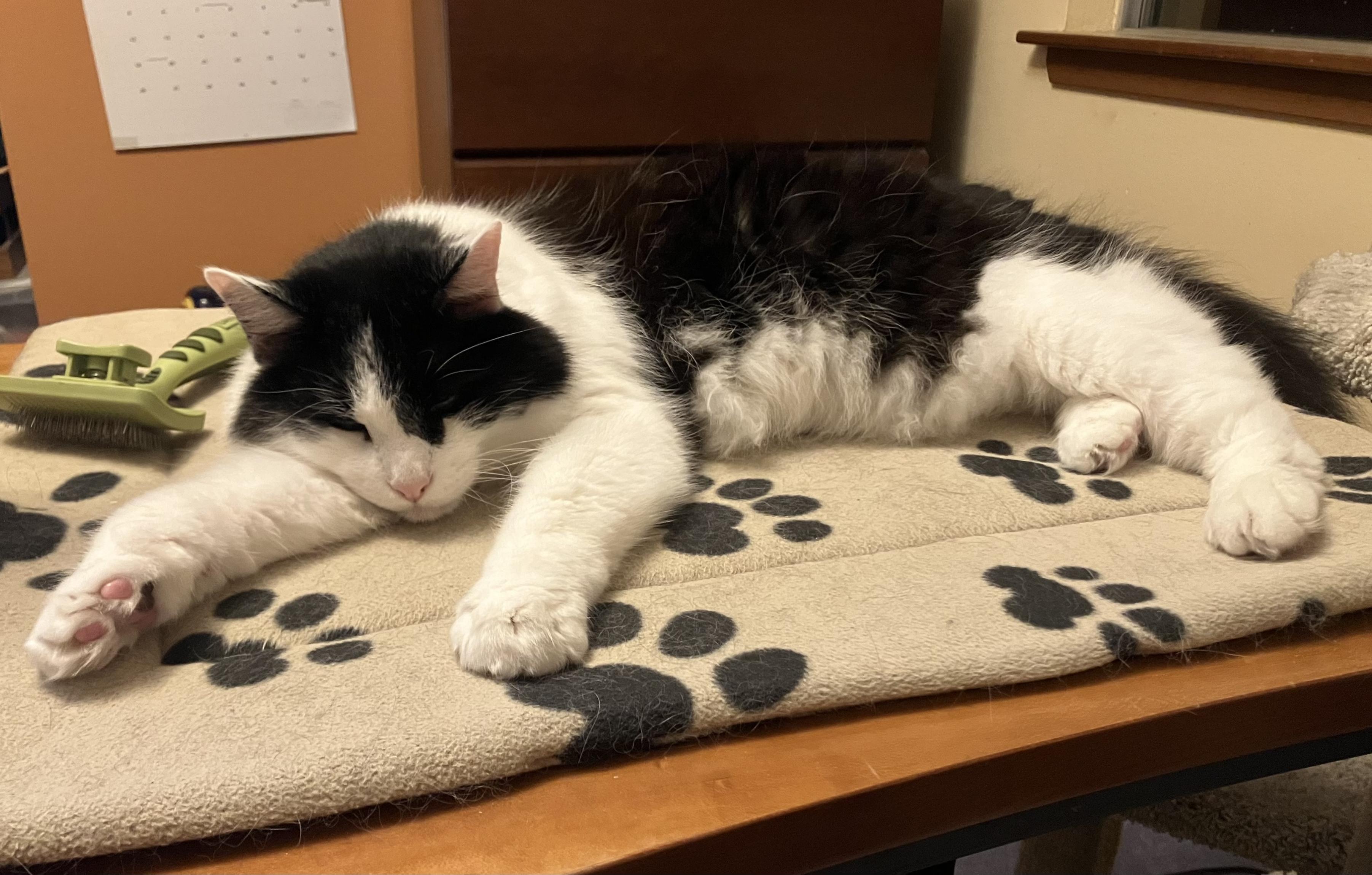 A medium-hair tuxedo cat, sprawled out sleeping on a cat mat on a desk. His front paws are extended in front of him, and you can see the his pink beans on one of them.