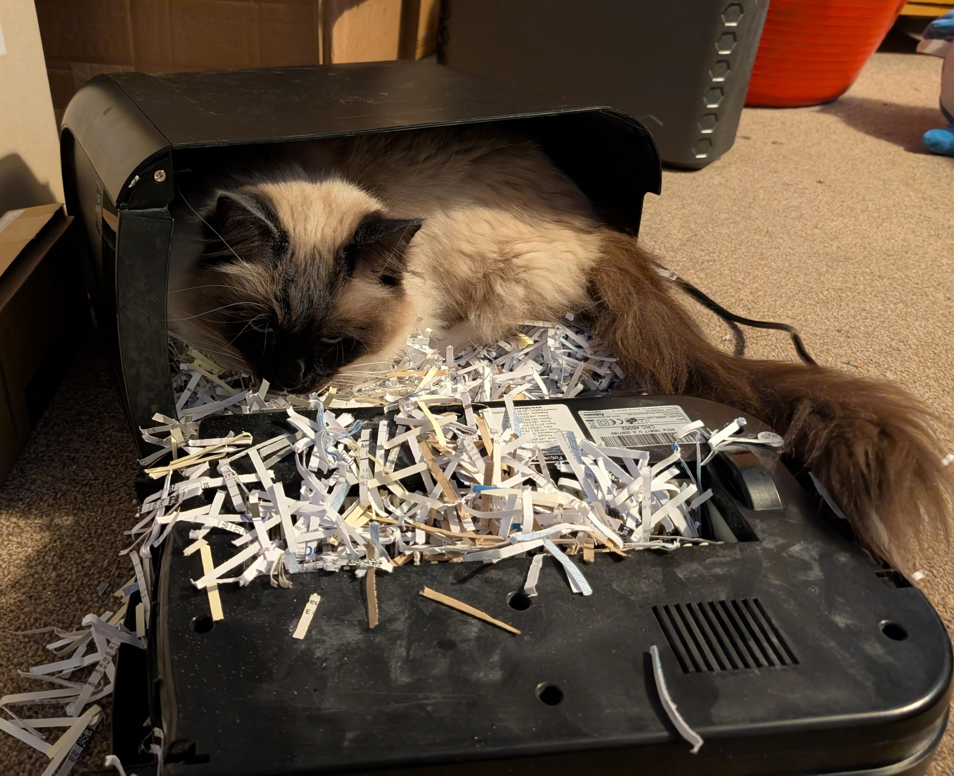 Somebody knocked over the shredder, then decided the result made a good nest.