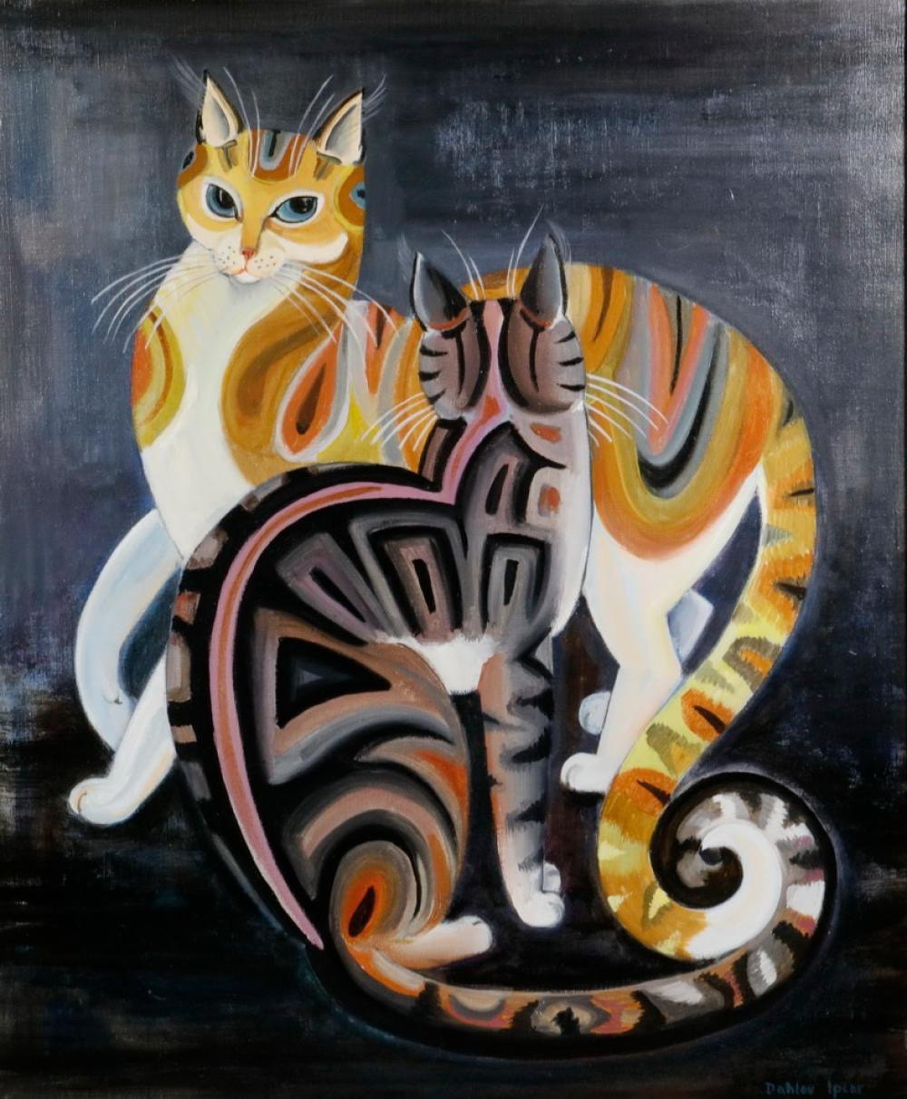painting depicting a pair of tabby / calico cats, one in back orange standing in side profile and one in front grey looking towards the other, both with white undersides, with tips of curled tails entwined, on grey background