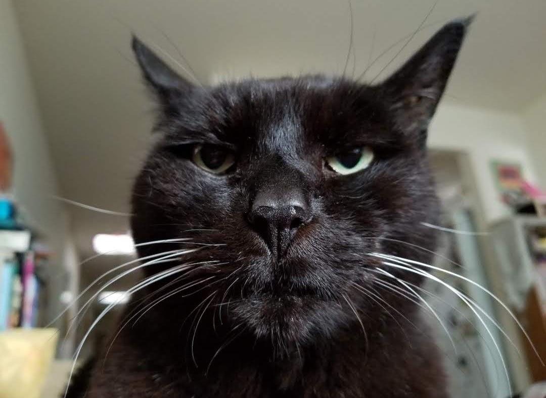 My beautiful queen Venus, who loved to sleep on me. We got her when she was 13, and she lived to about 20. Look at that panther face, heart nose, and white whiskers. #Caturday #CatsOfMastodon #catstodon #BlackCats