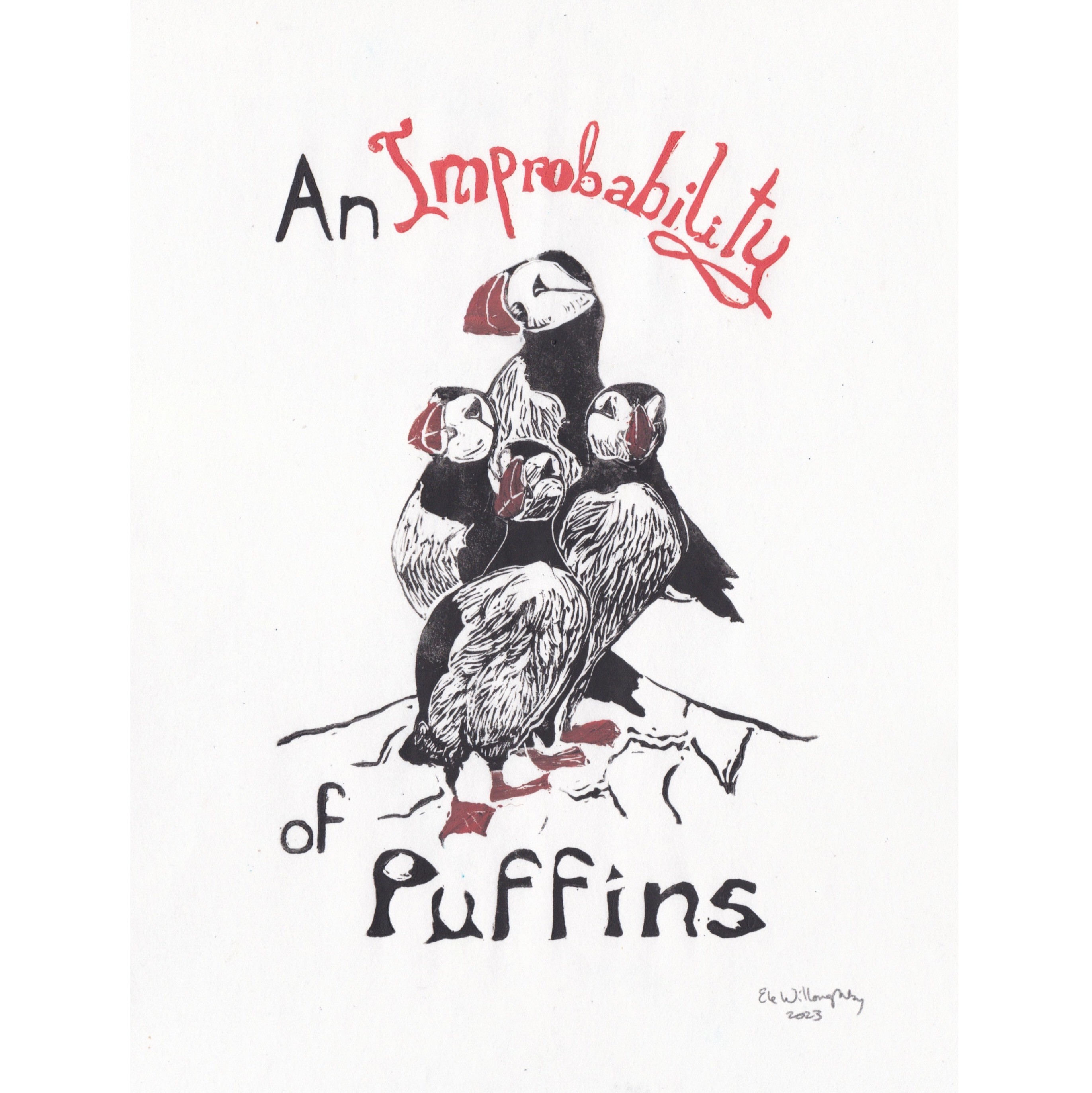 This linocut shows an improbability of puffins in all senses of the words. The collective noun for a group of puffins is an “improbability”. Isn’t that marvellous? Puffins look rather improbable to me, with their tuxedo coats and tails and their red, Roman noses... I mean beaks. These are Atlantic puffins, to be precise. Actually, there are a few different words for a group of puffins, including “a puffinry of puffins” (which seems 🧵