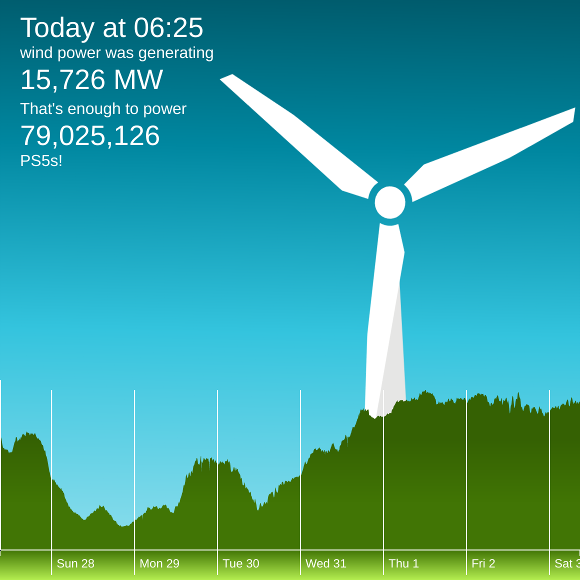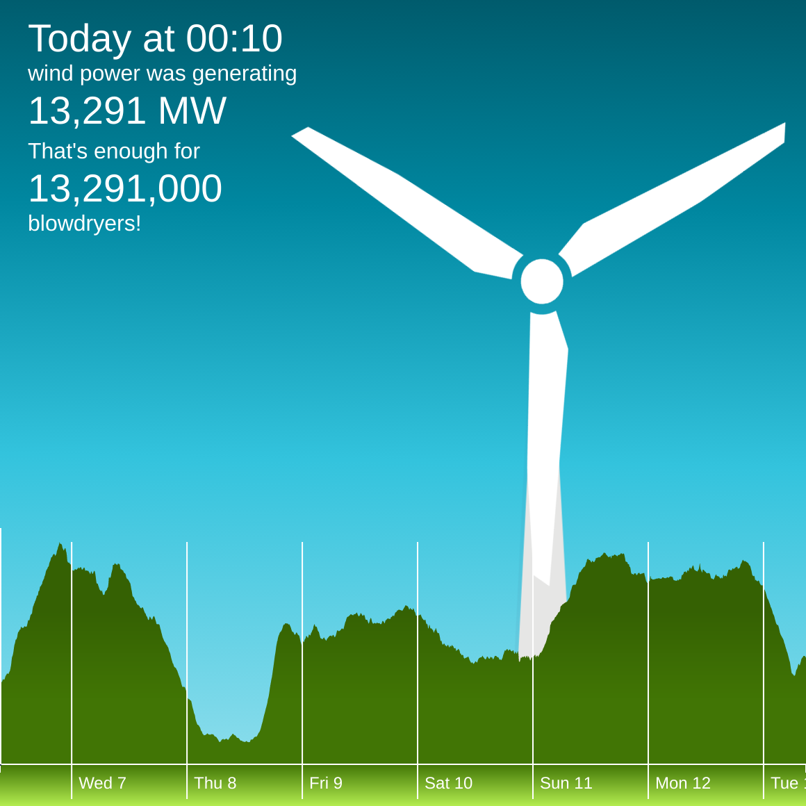 While you were sleeping, #windEnergy reached 59% of the National Grid's electricity demand. https://winderful.uk