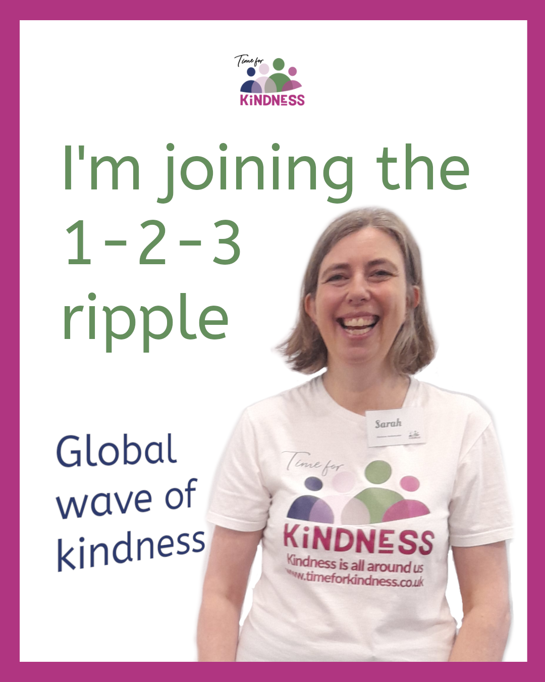 Sarah, a woman with light skin tone and shoulder length light brown hair smiling broadly wearing a Time for Kindness t-shirt. Beside her text reads “I’m joining the 1-2-3 ripple global wave of kindness.”