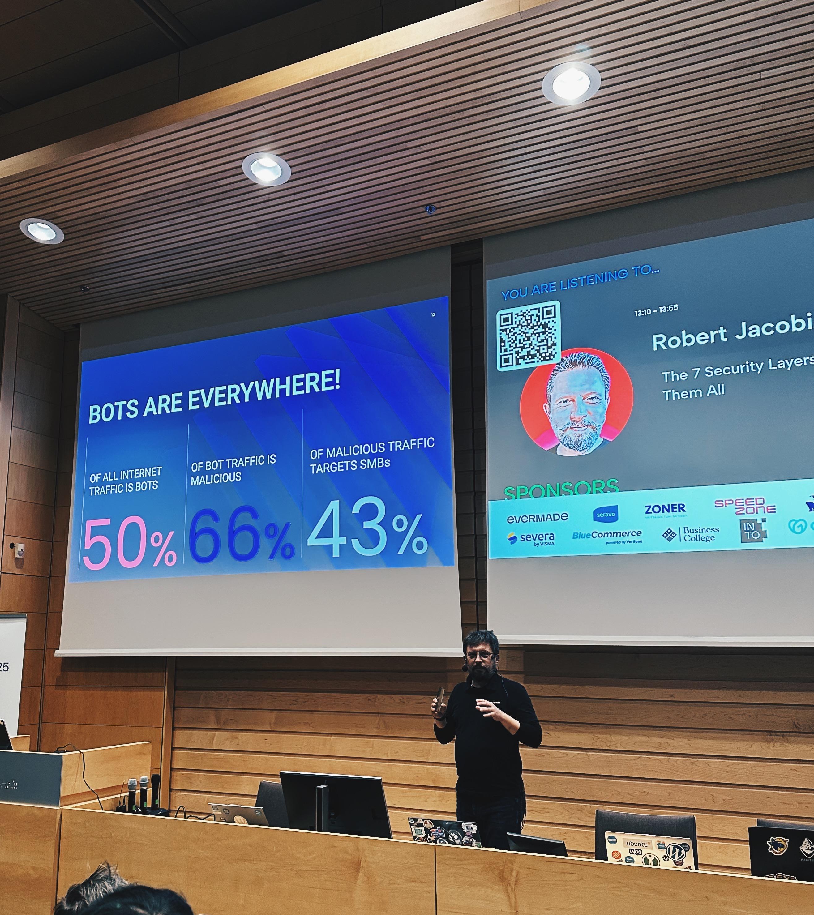 BOTS ARE EVERYWHERE. 50% of all Internet traffic are bots, 66% of bot traffic is malicious, 43% targets SMBs. @robert