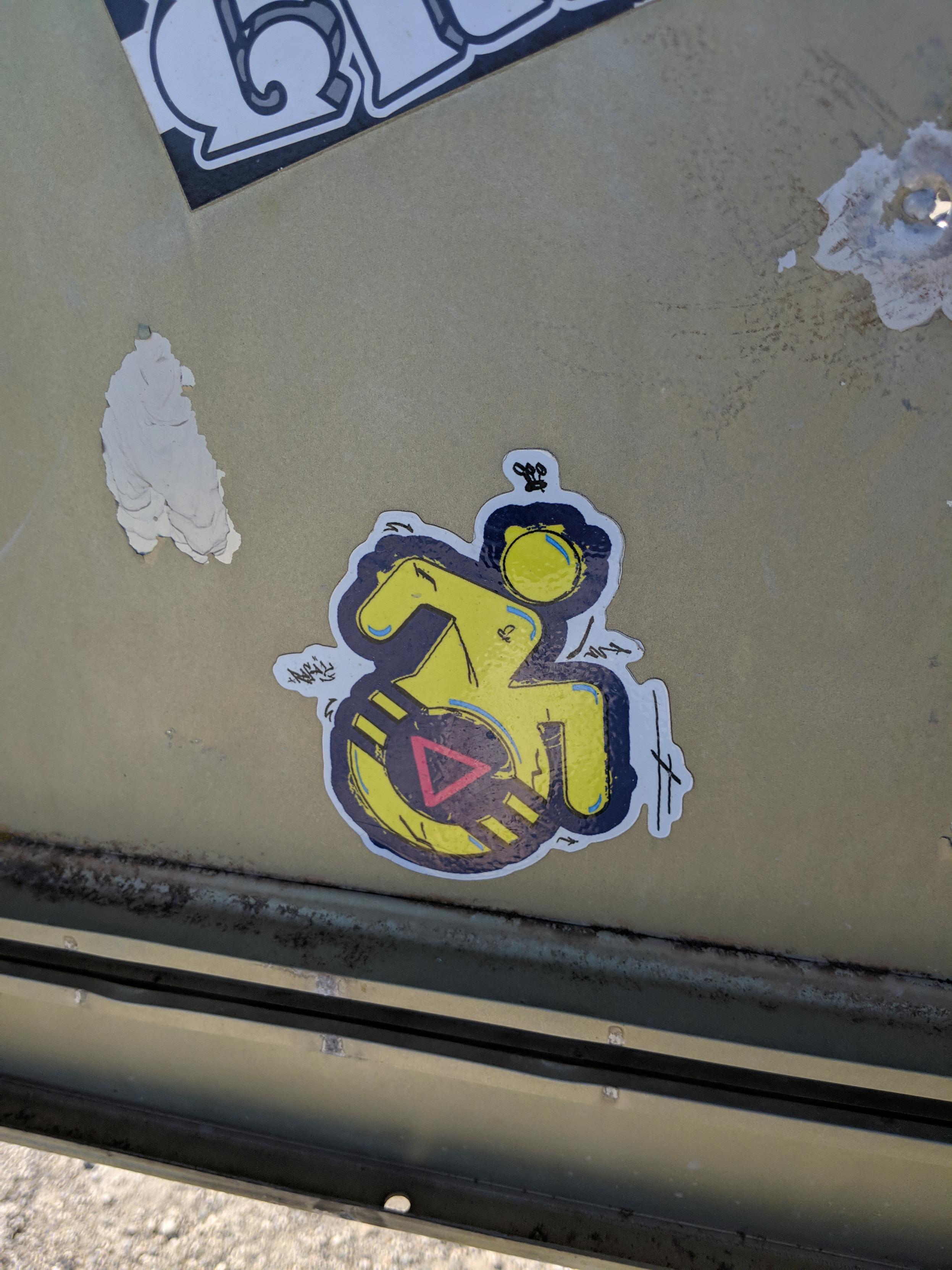 Pour une fois je suis tombé sur un sticker avec un fauteuil roulant. Je me demande si le triangle est engagé ou non. vous avez une idée de l’autrice ?