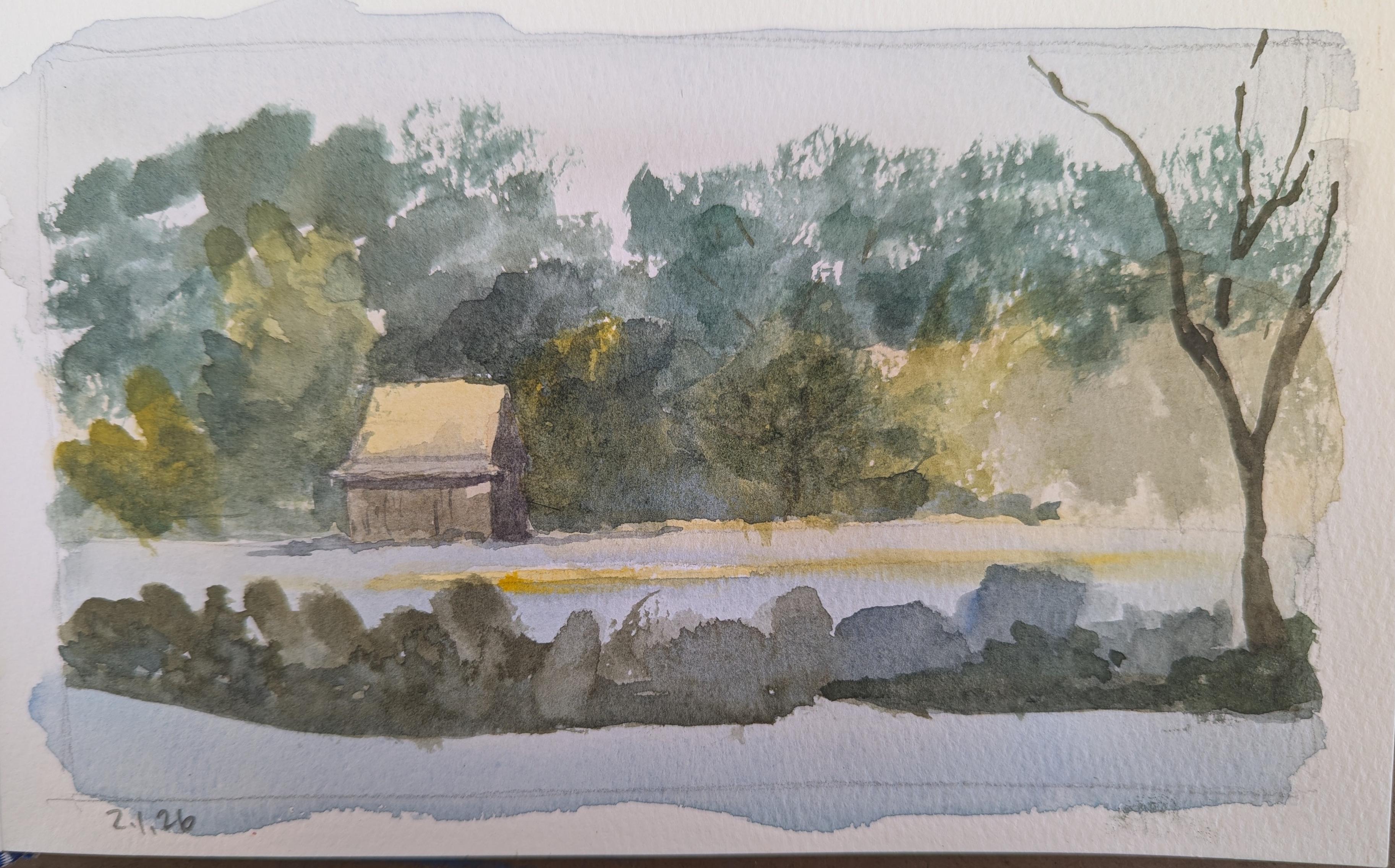 A watercolour painting I made six years ago. I don't paint much these days. I write, instead. #watercolor #watercolour #landscape #winter #ArtistsOnMastodon