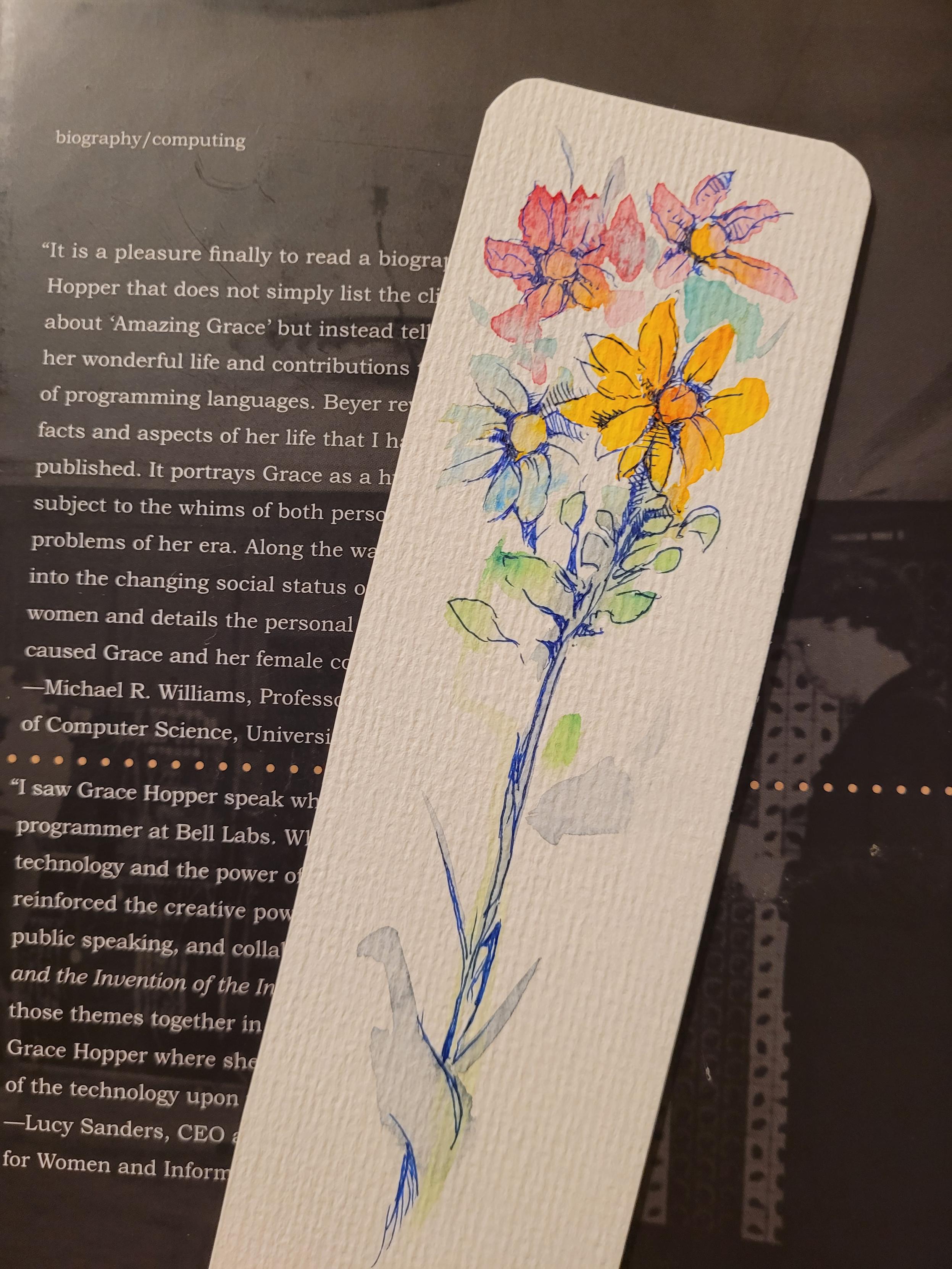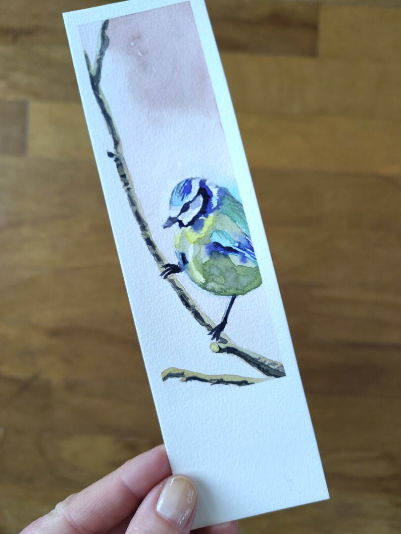 I had a strip of watercolor paper left over, so I freehanded some round corners with scissors and make a quick bookmark...because you can *never* have too many bookmarks!