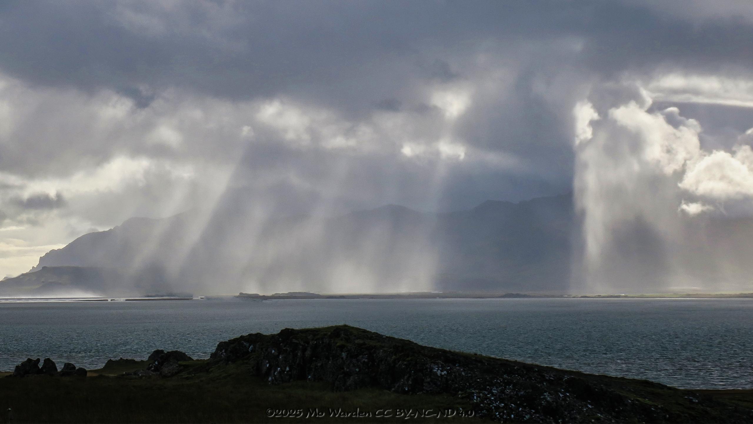 From under a blanket of heavy cloud, we looked towards the headland and saw this breathtaking sight, sunbeams streaming through a heavy rain shower on the shore of Hlíðarfjall.